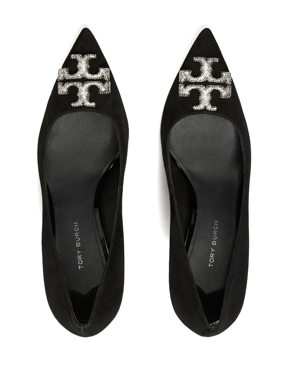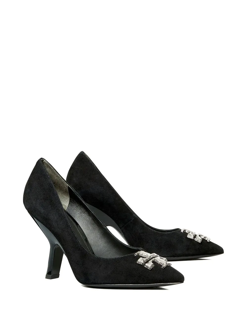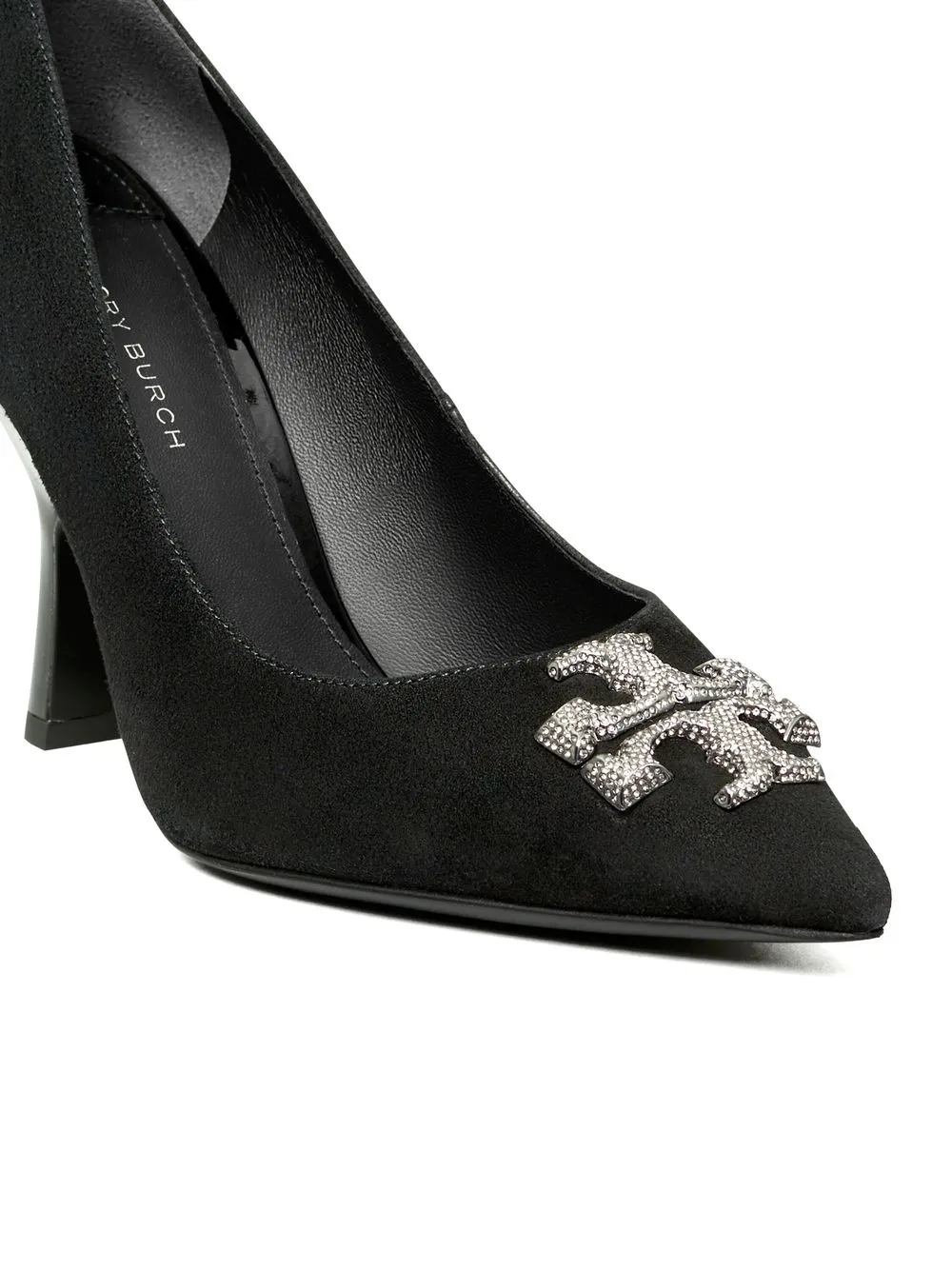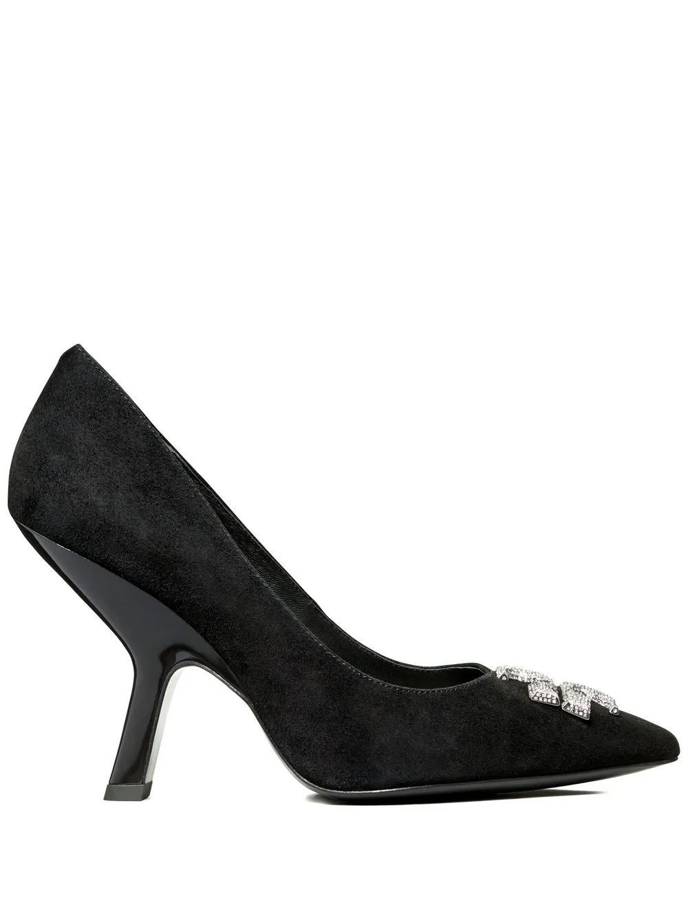100mm Eleanor Pave pumps from TORY BURCH featuring black, calf leather, suede, silver-tone logo plaque, crystal embellishment, pointed toe, branded insole and high heel.
