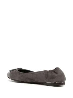 10mm logo-plaque ballerina shoes from TORY BURCH featuring dark grey, silver-tone logo plaque, round toe, low heel and slip-on style.