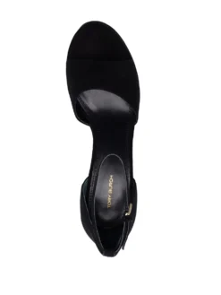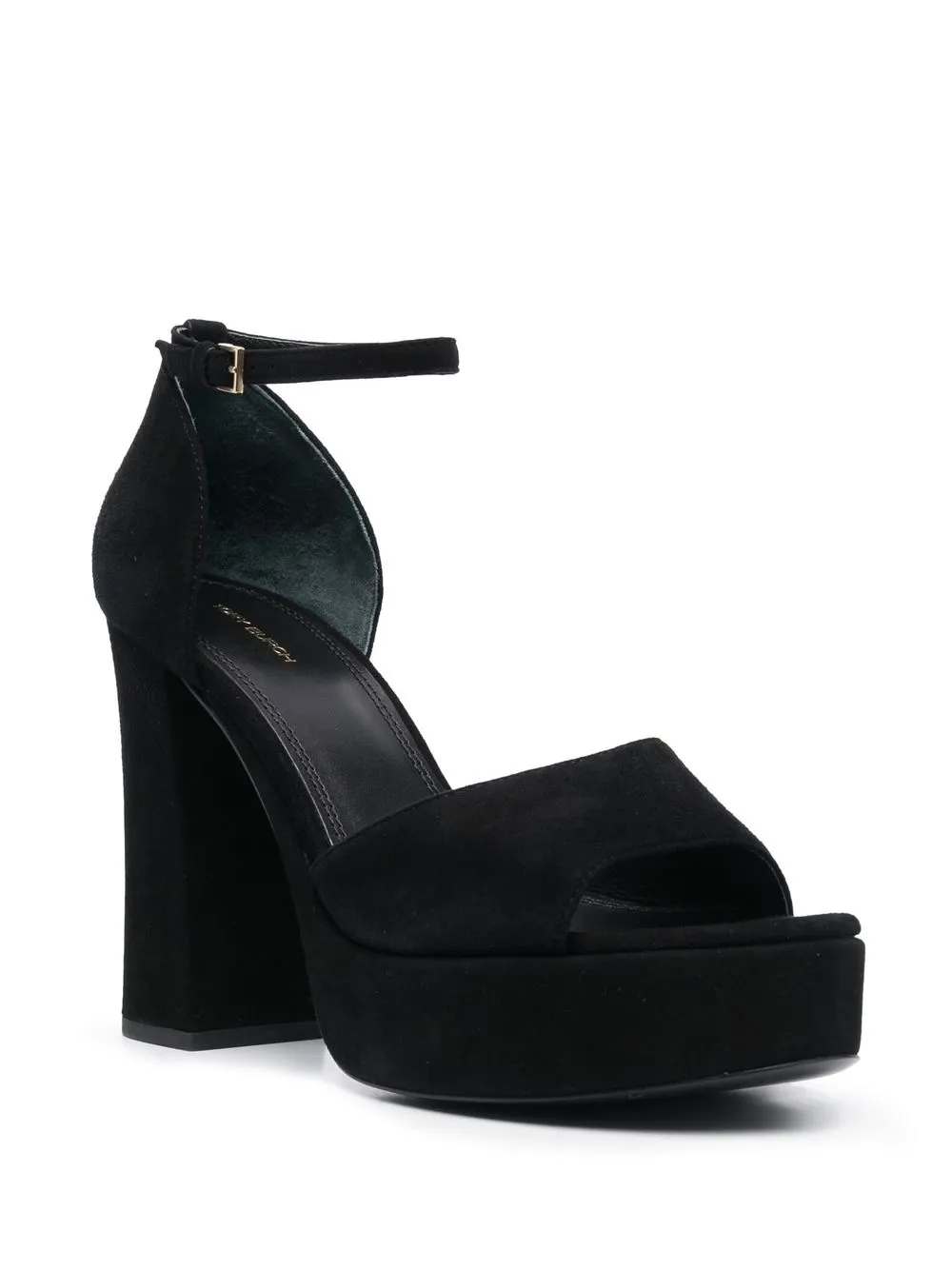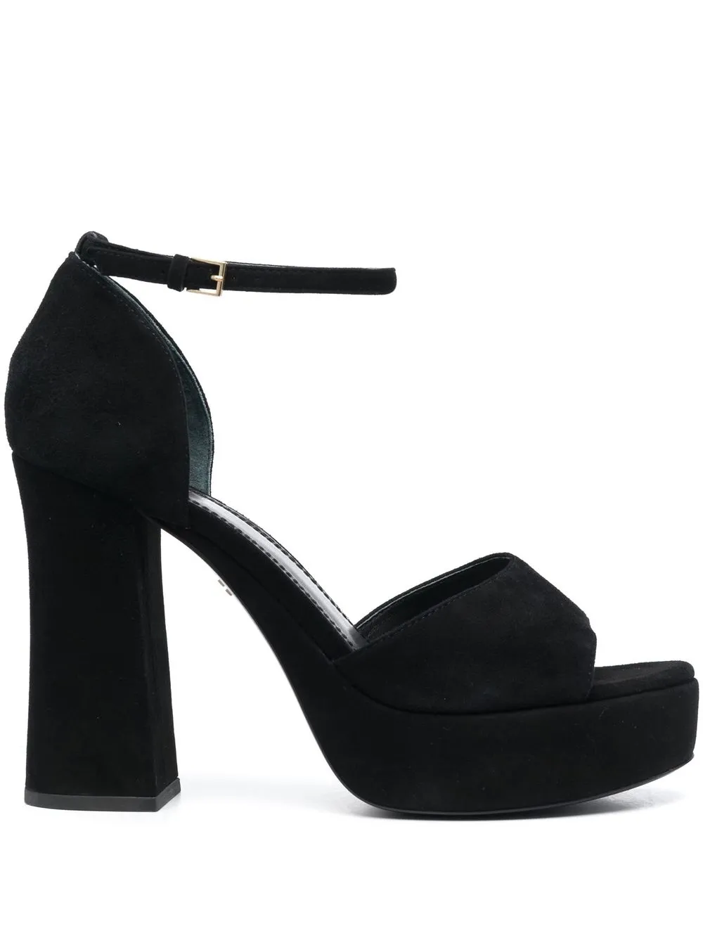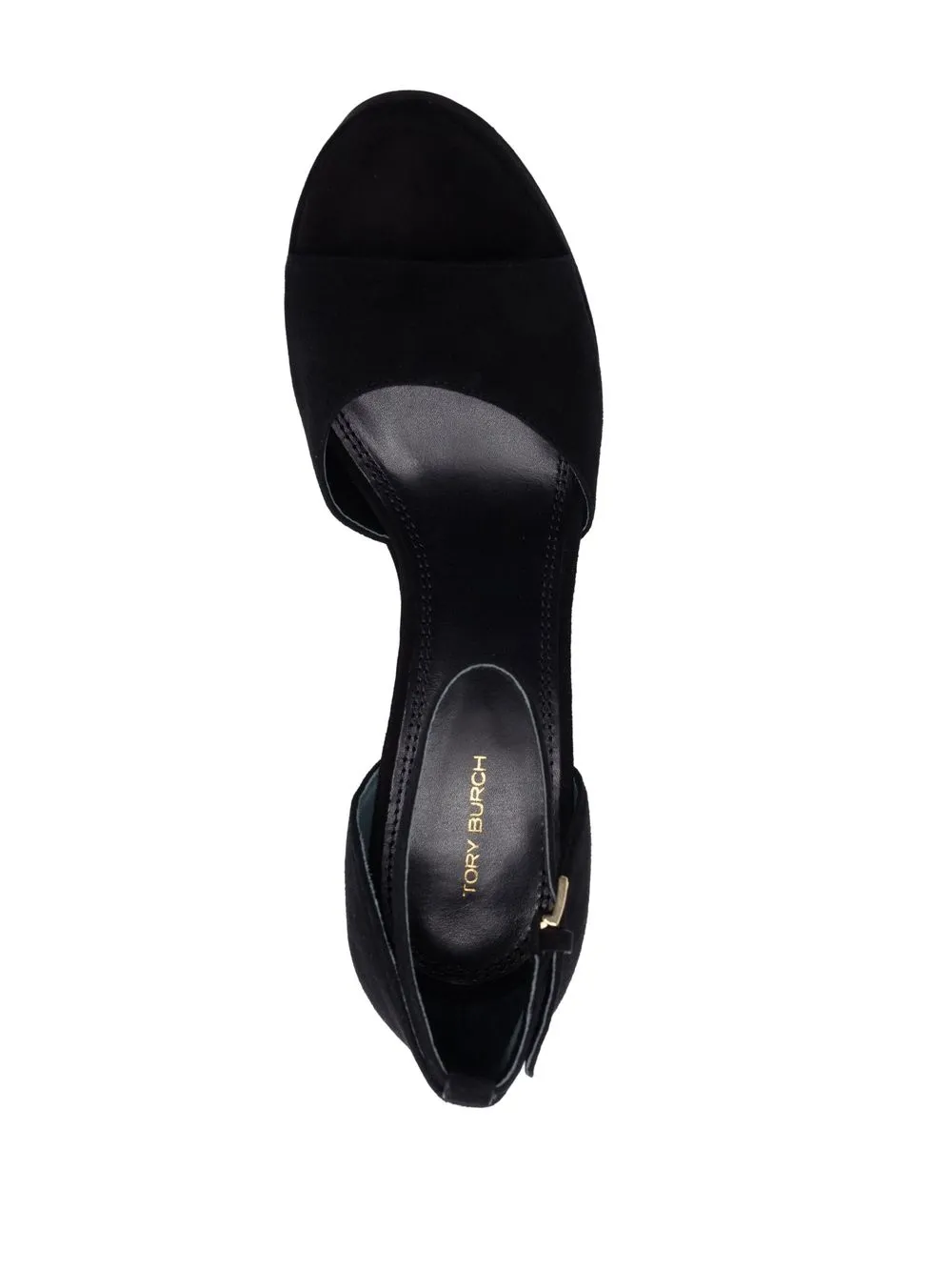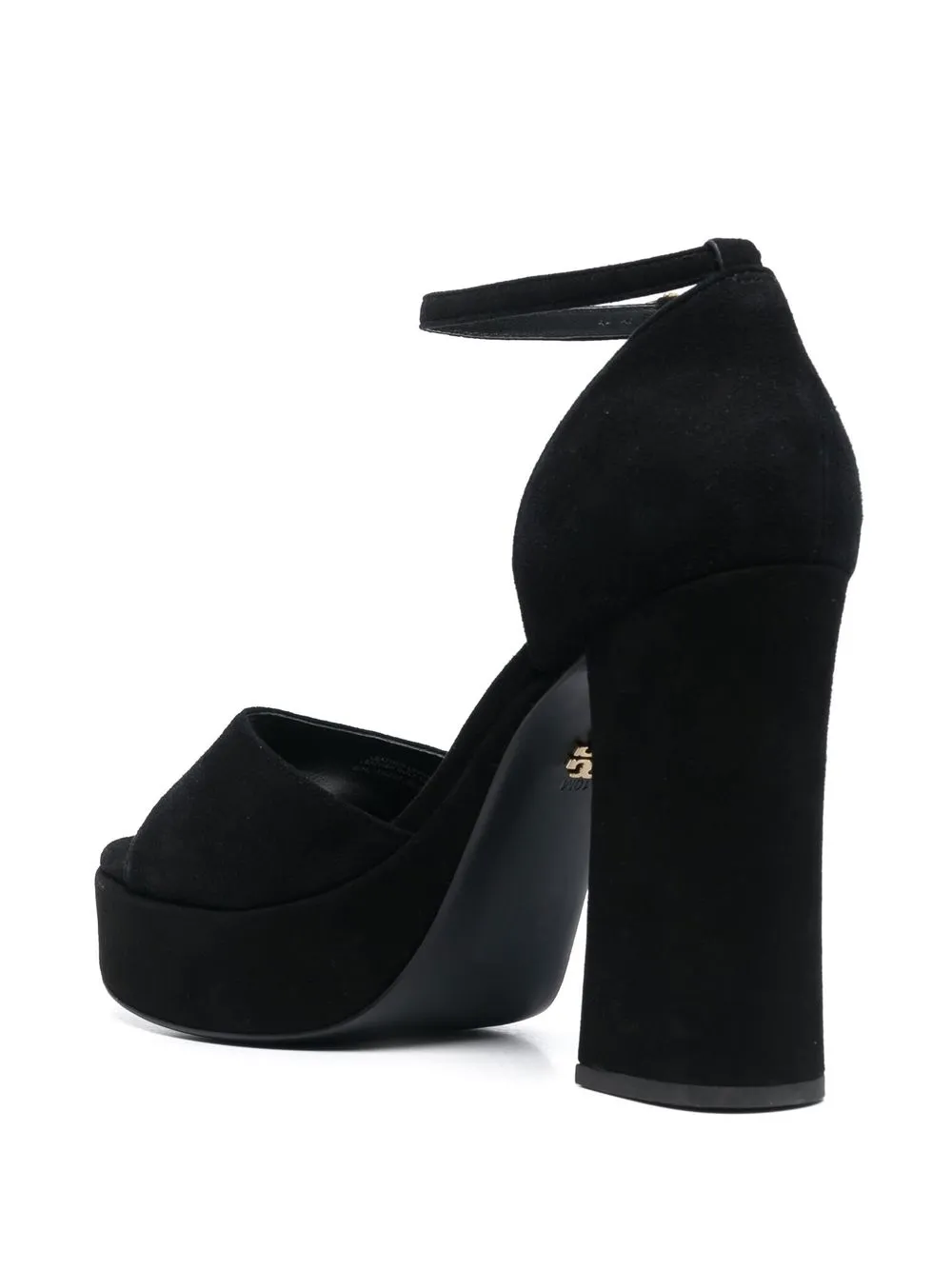 120mm leather platform sandals from TORY BURCH featuring jet black, calf leather, buckle-fastening ankle strap, branded leather insole, open toe, platform sole and high block heel.