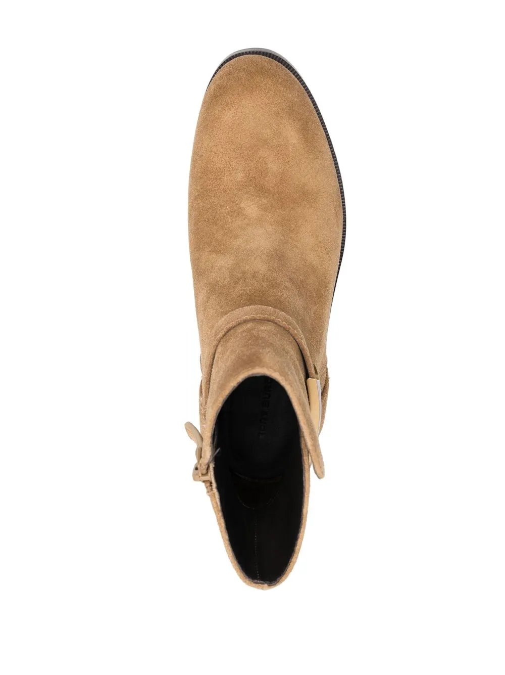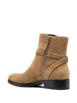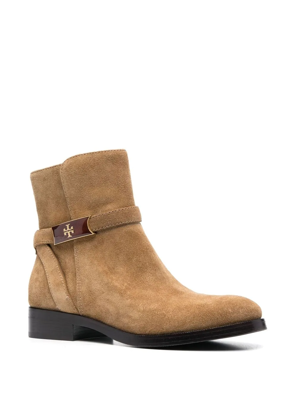 25mm logo-plaque suede boots from TORY BURCH featuring camel brown, calf suede, logo plaque, side zip fastening, round toe and low heel.