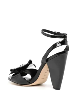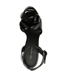 90mm leather flower-detail pumps from TORY BURCH featuring jet black, floral appliqué, buckle-fastening ankle strap, branded leather insole, open toe, high tapered heel and leather.