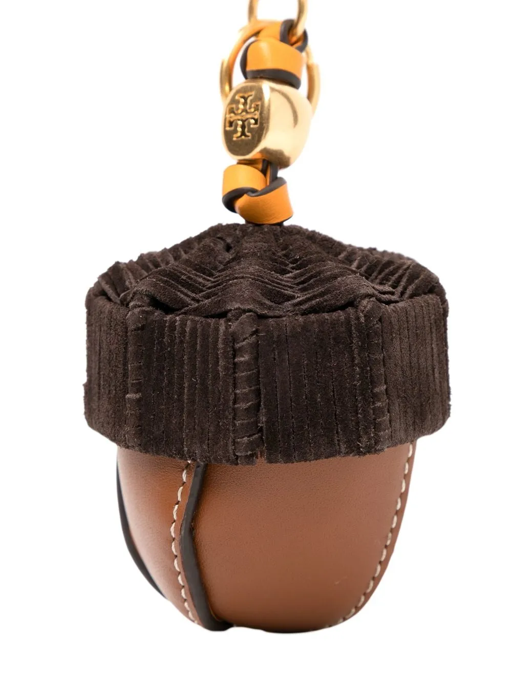 acorn key fob charm from TORY BURCH featuring brown, calf leather, engraved logo and keyring attachment.