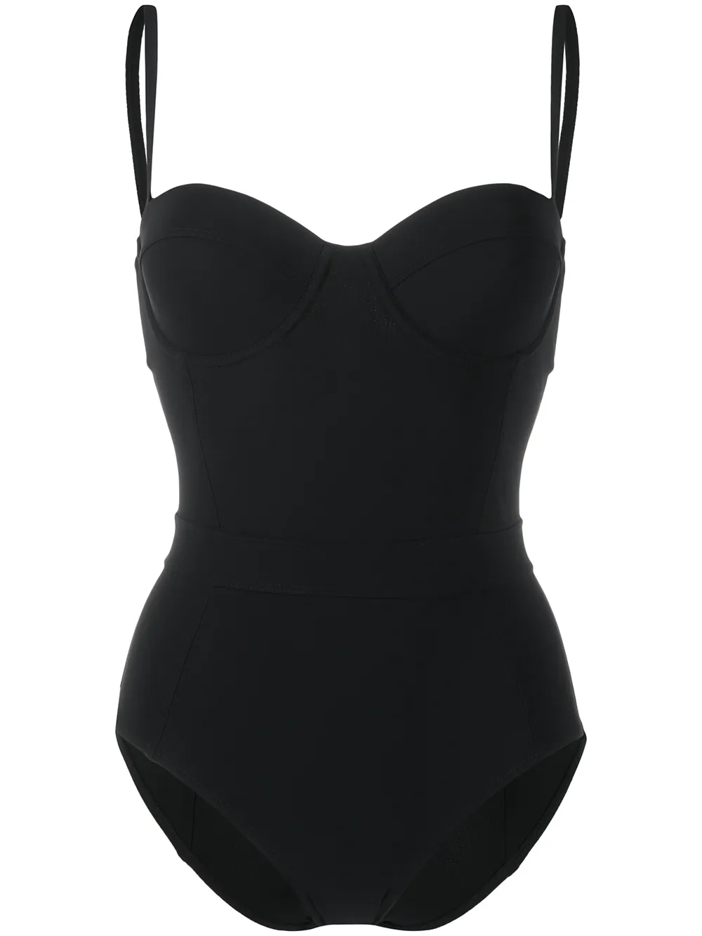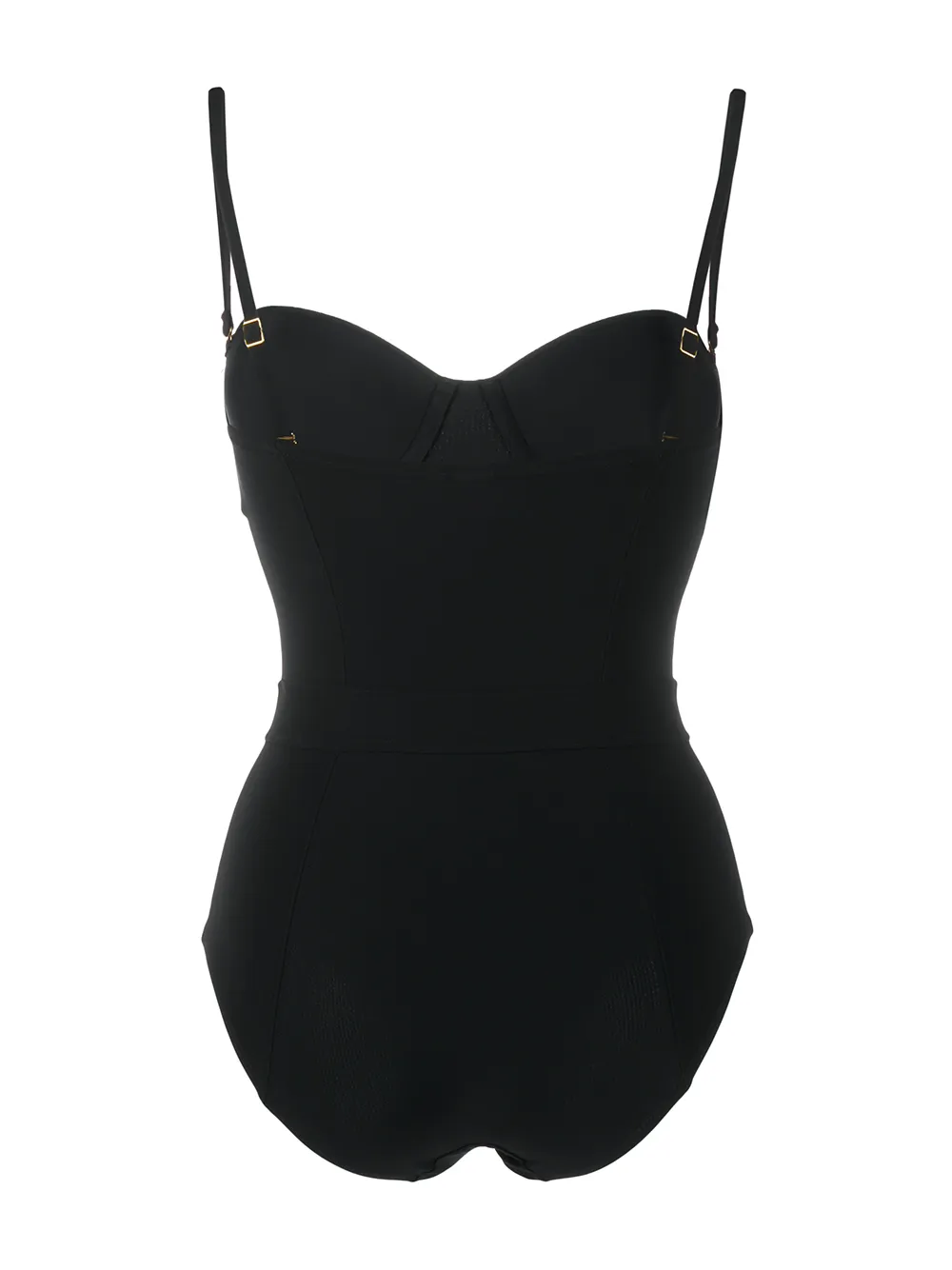 Black nylon-blend balconette swimsuit from TORY BURCH featuring underwire cup, adjustable shoulder straps, panelled design, fitted silhouette and three piece cup.
