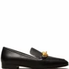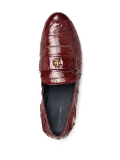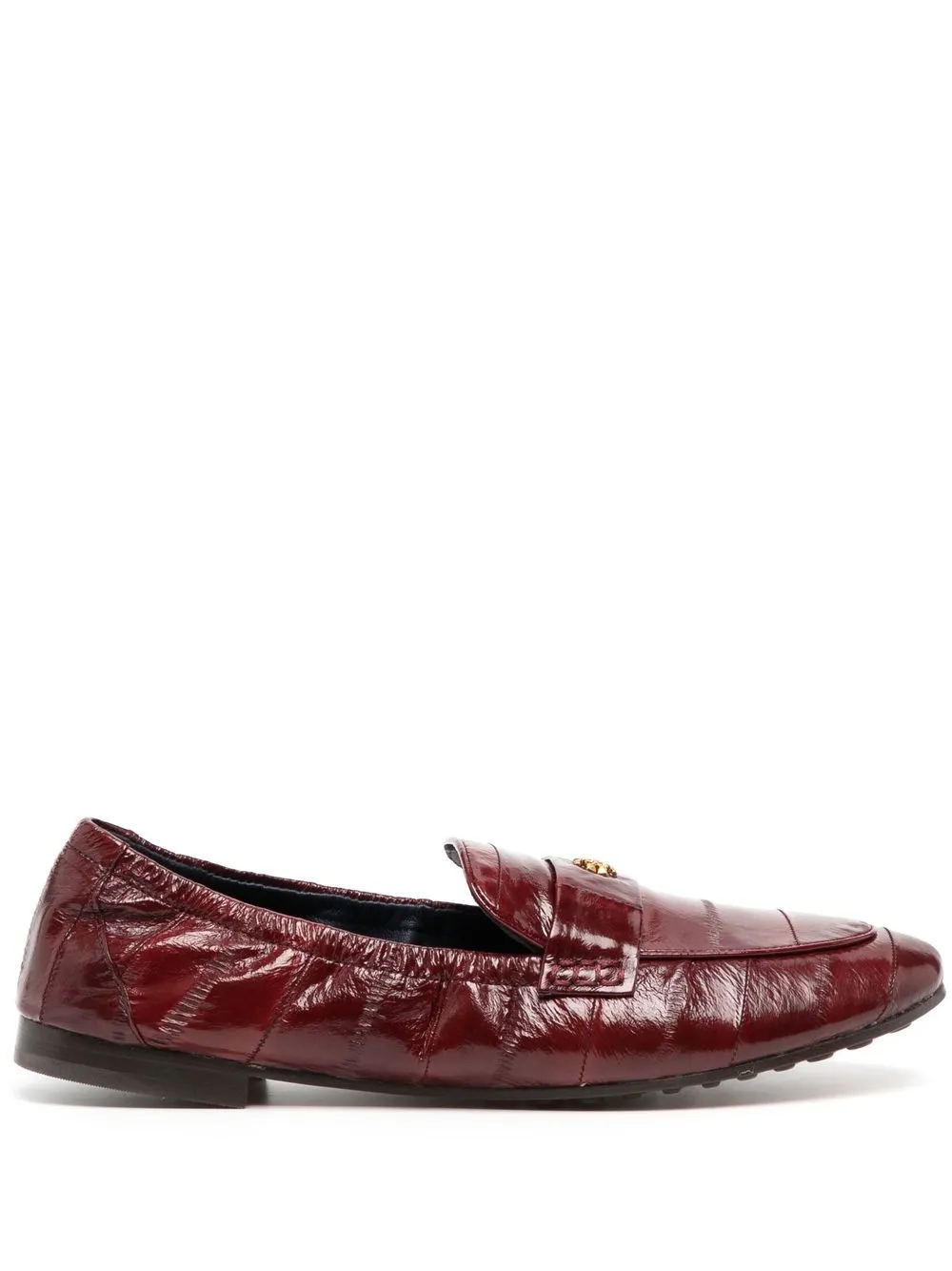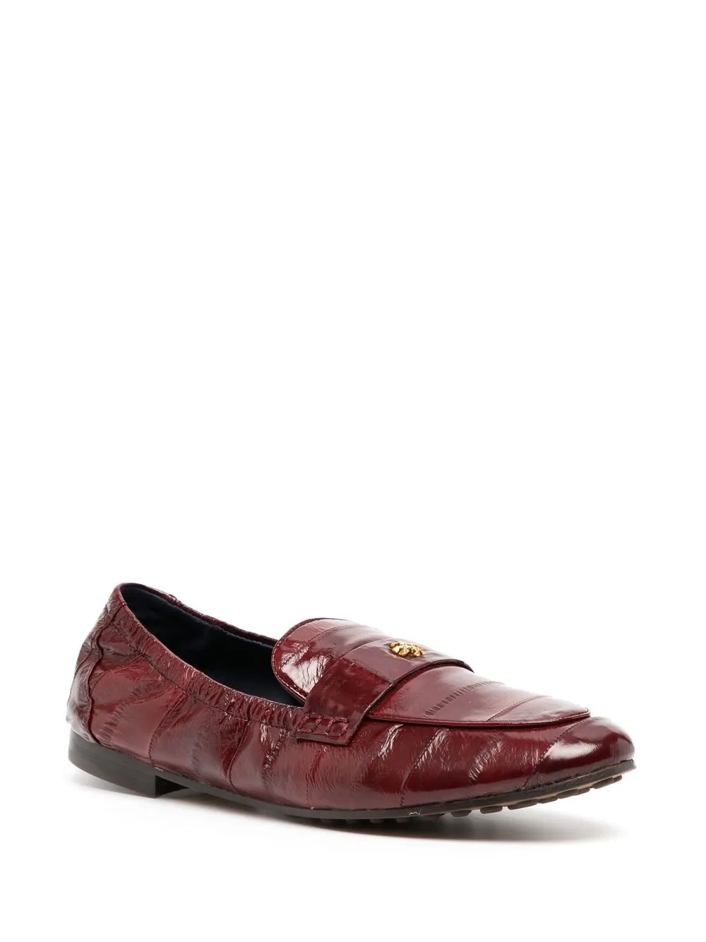 Ballet 20mm loafers from TORY BURCH featuring dark red, calf leather, signature Double T motif, round toe, branded insole, low block heel and leather outsole.