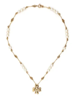 Brutalist pendant necklace from TORY BURCH featuring 18kt gold plated, brass, faux-pearl detailing, antique-effect hardware, signature Double T motif, logo pendant and clasp fastening.