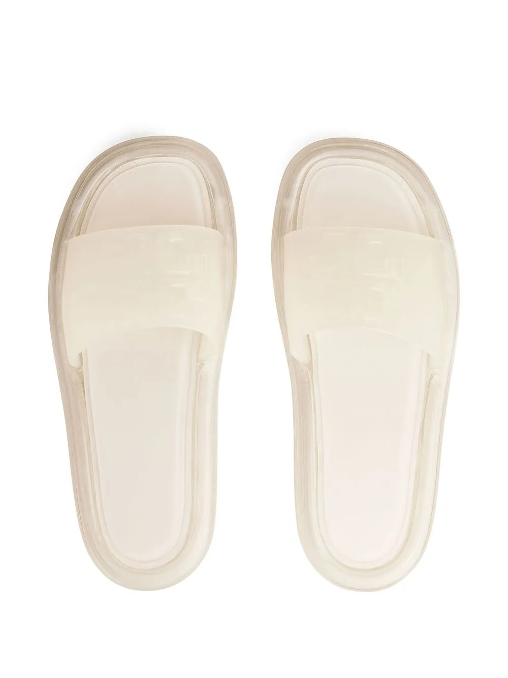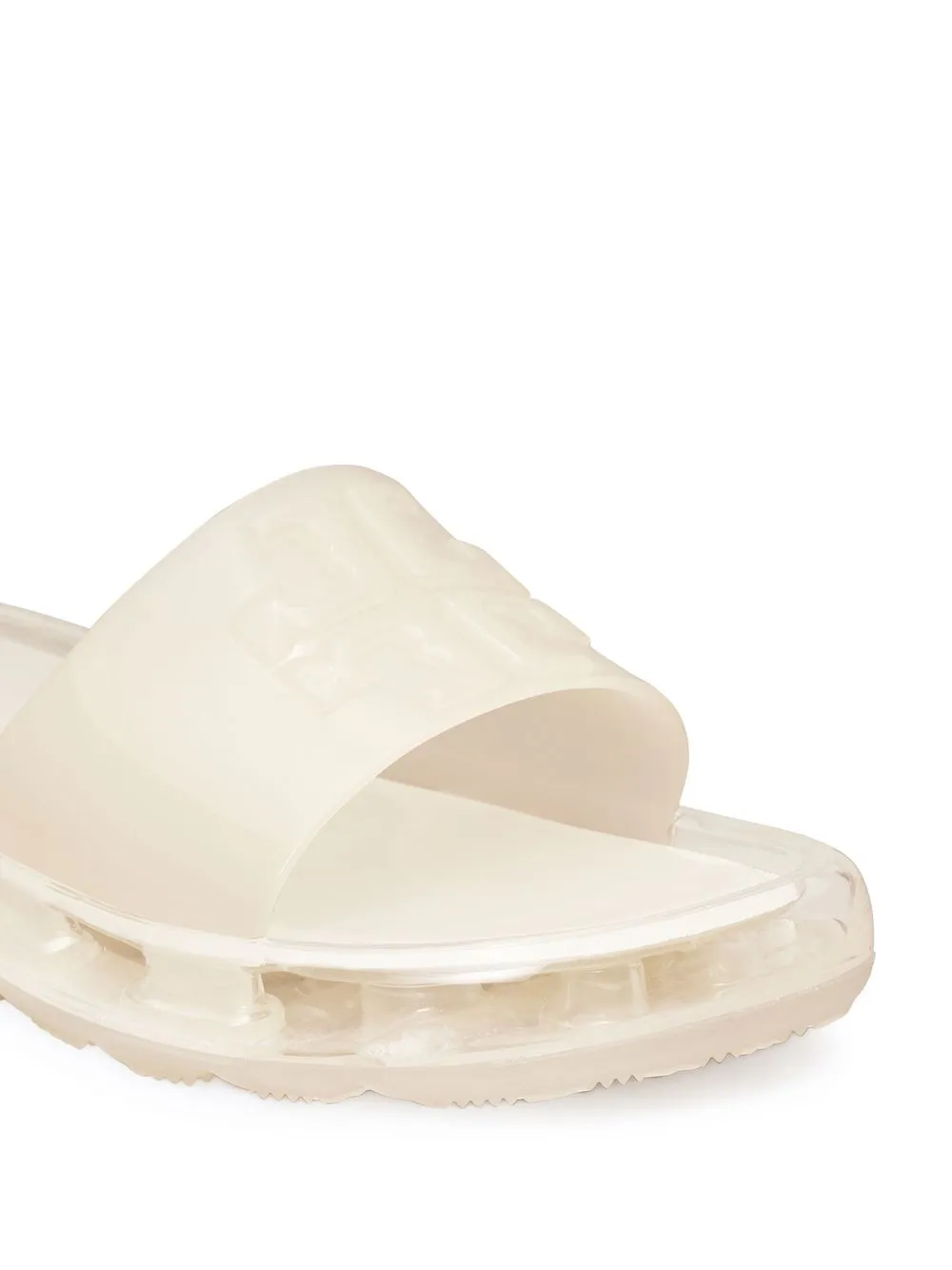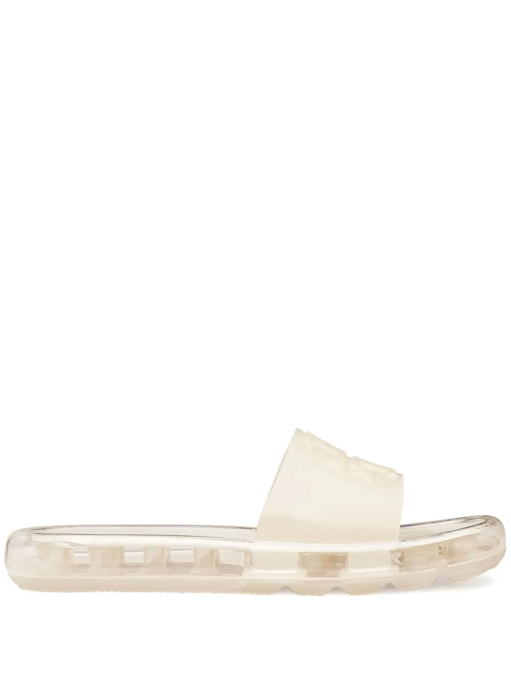 Bubble Jelly single strap slides from TORY BURCH featuring ivory white, embossed logo to the front, open toe, single toe strap, branded footbed, translucent rubber sole, slip-on style and waterproof.