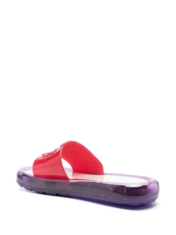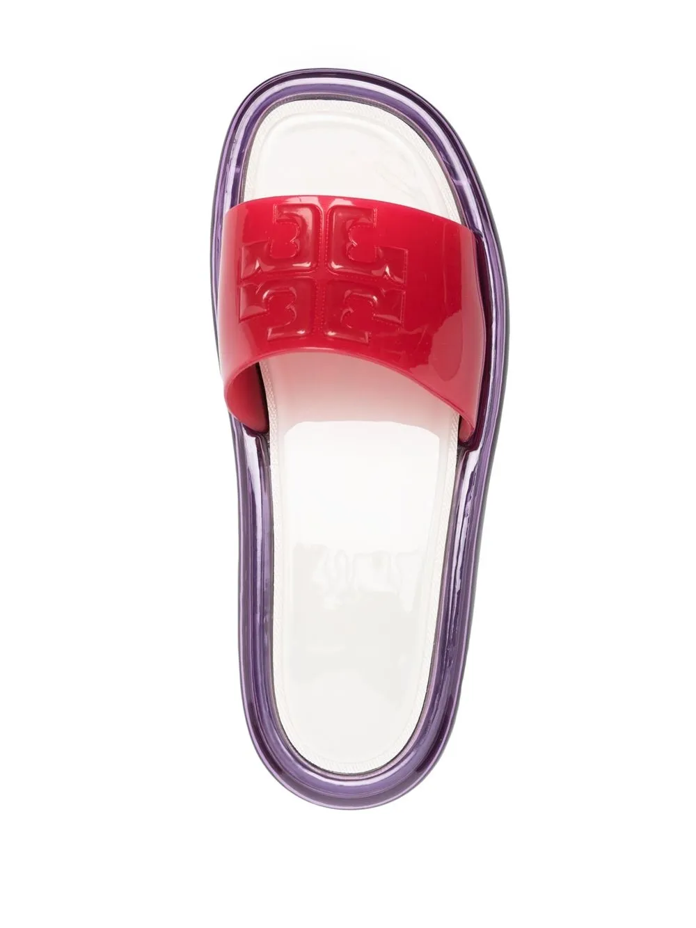 Bubble jelly sliders from TORY BURCH featuring bright red, grape purple, transparent design, signature Double T motif, embossed logo to the front, open toe and flat sole.