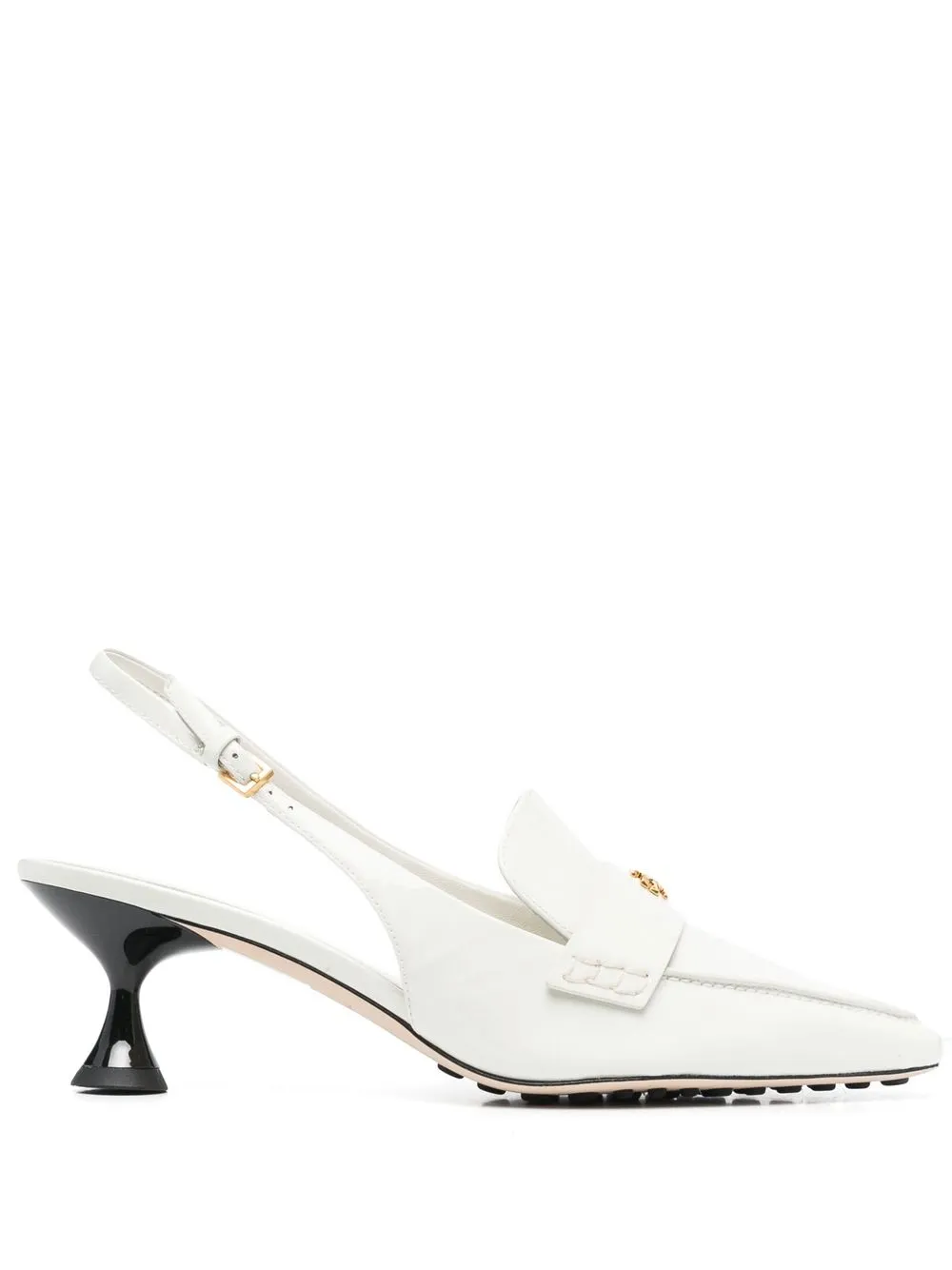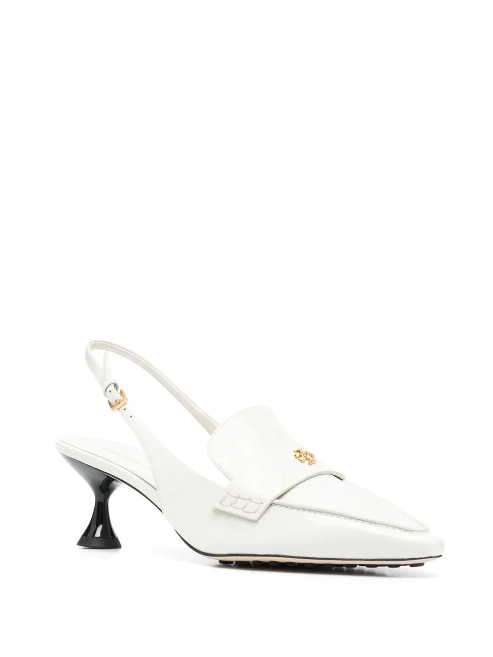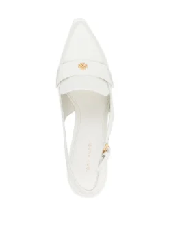 buckled slingback pumps from TORY BURCH featuring ivory white, calf leather, patent finish, signature TB monogram plaque, gold-tone hardware, pointed toe, buckle-fastening slingback strap, branded insole and kitten heel.