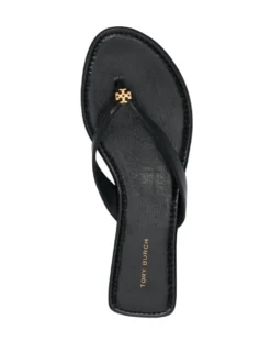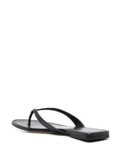 Capri logo-plaque flip-flops from TORY BURCH featuring Medusa plaque detail, thong strap, black, calf leather and flat sole.