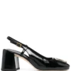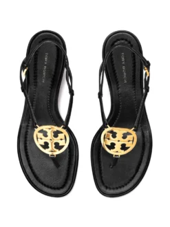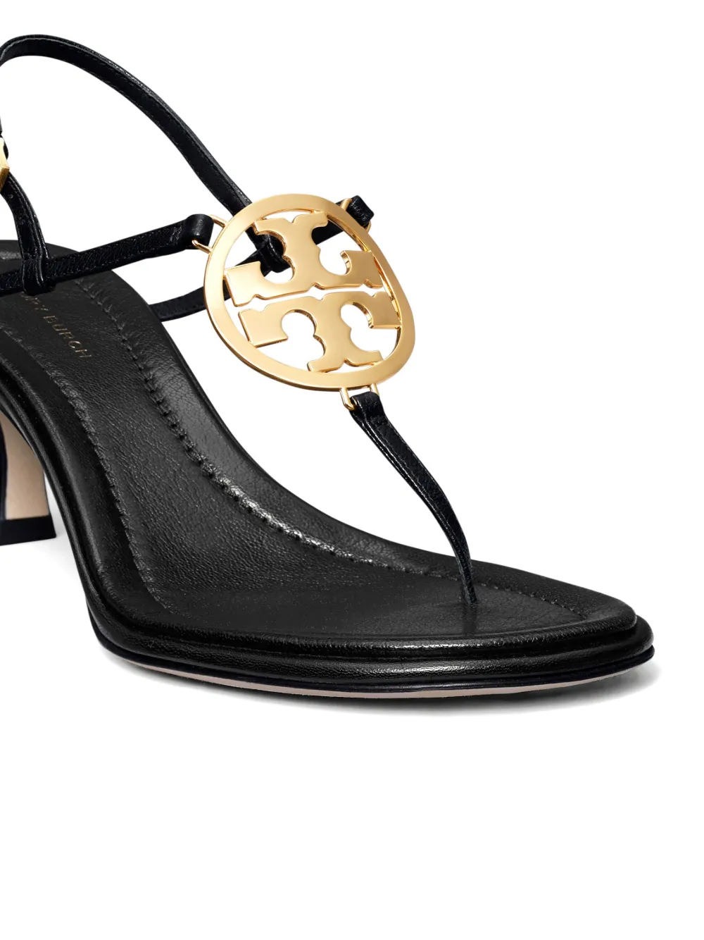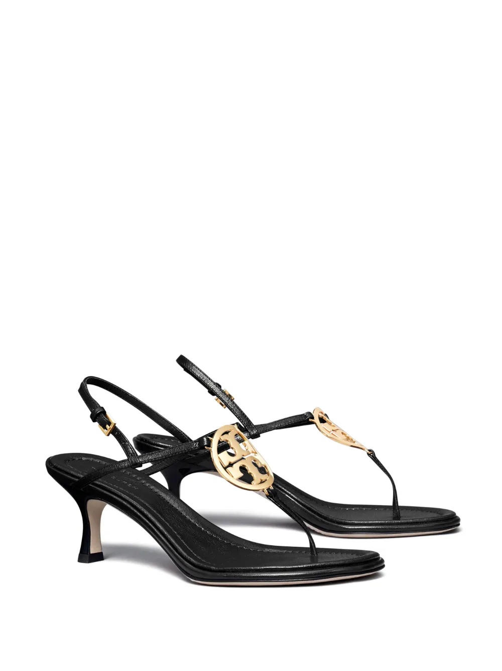 Tory Burch’s Capri Miller sandals take on a minimalist silhouette. Crafted in leather with a cushioned footbed and lacquered heel, it is detailed with an oversized Double T gold-tone coin.