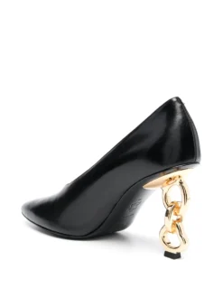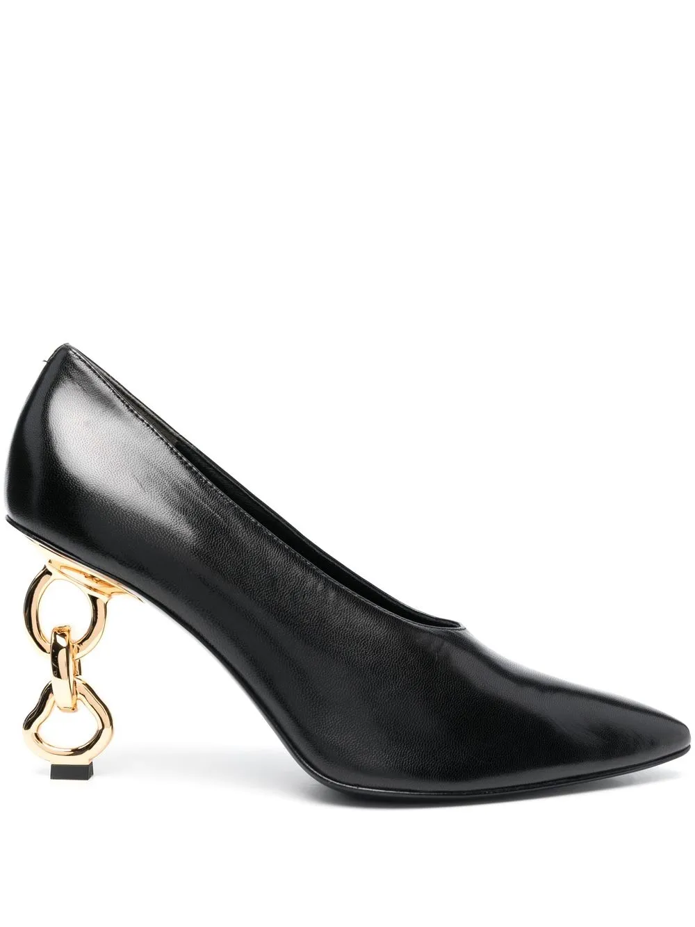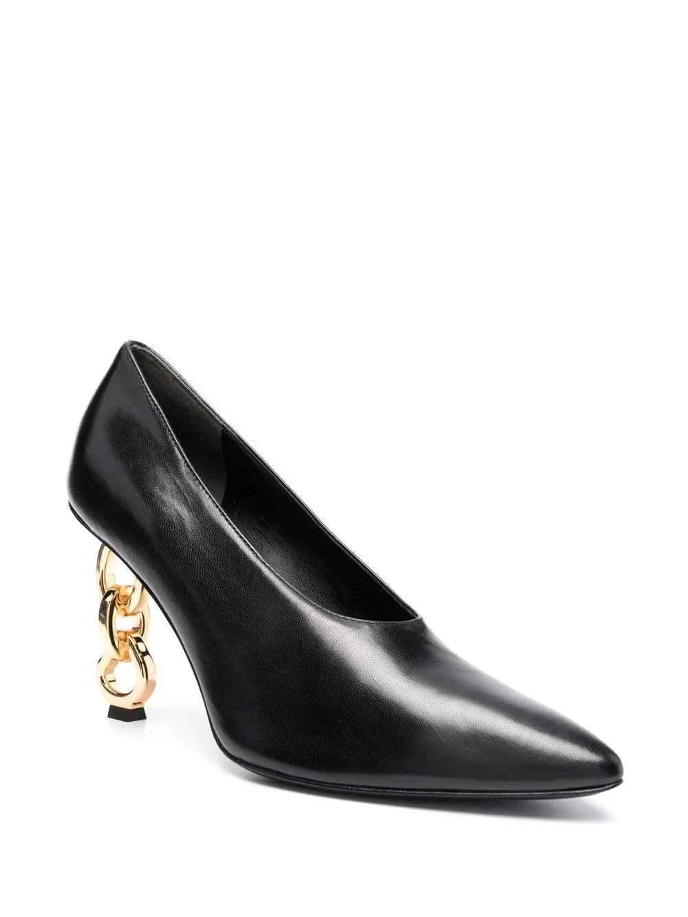 Chain 100mm pumps from TORY BURCH featuring black, calf leather, chain-link detailing, pointed toe, branded leather insole, high sculpted heel and leather sole.