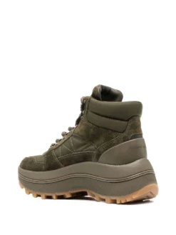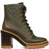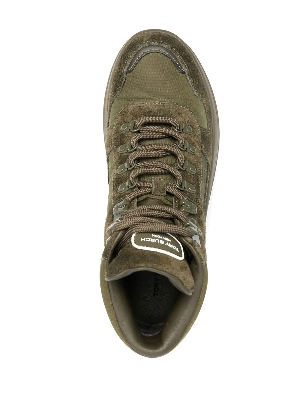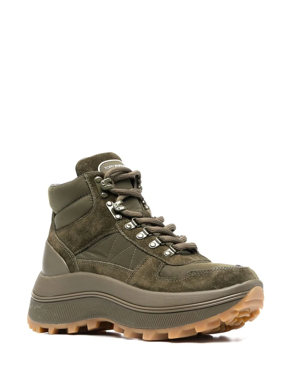 chunky-sole leather boots from TORY BURCH featuring forest green, calf leather, panelled design, logo patch at the tongue, chunky rubber sole, front lace-up fastening and round toe.