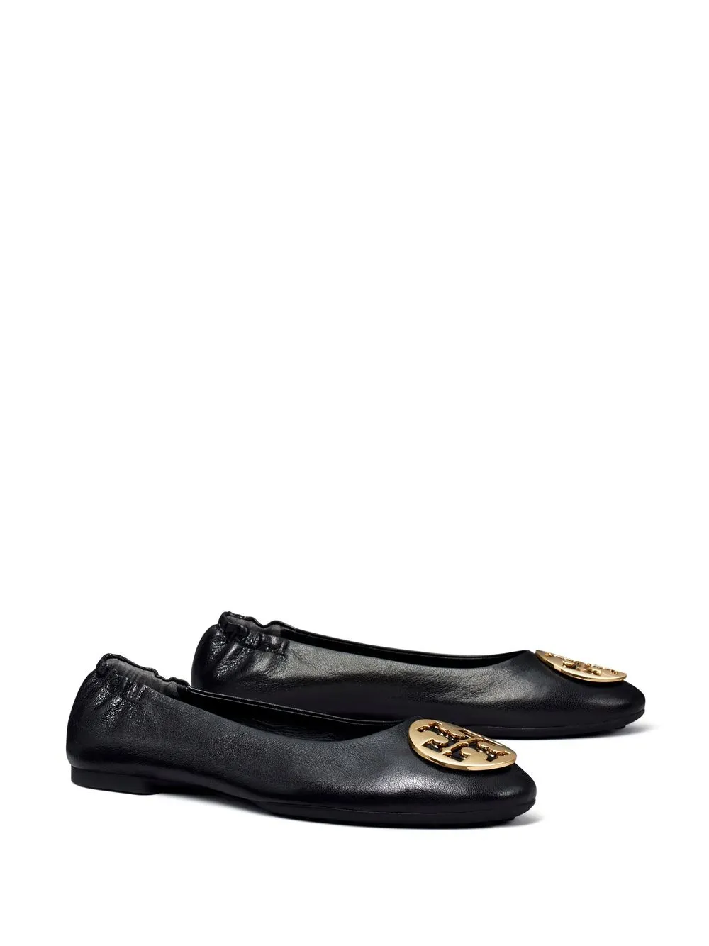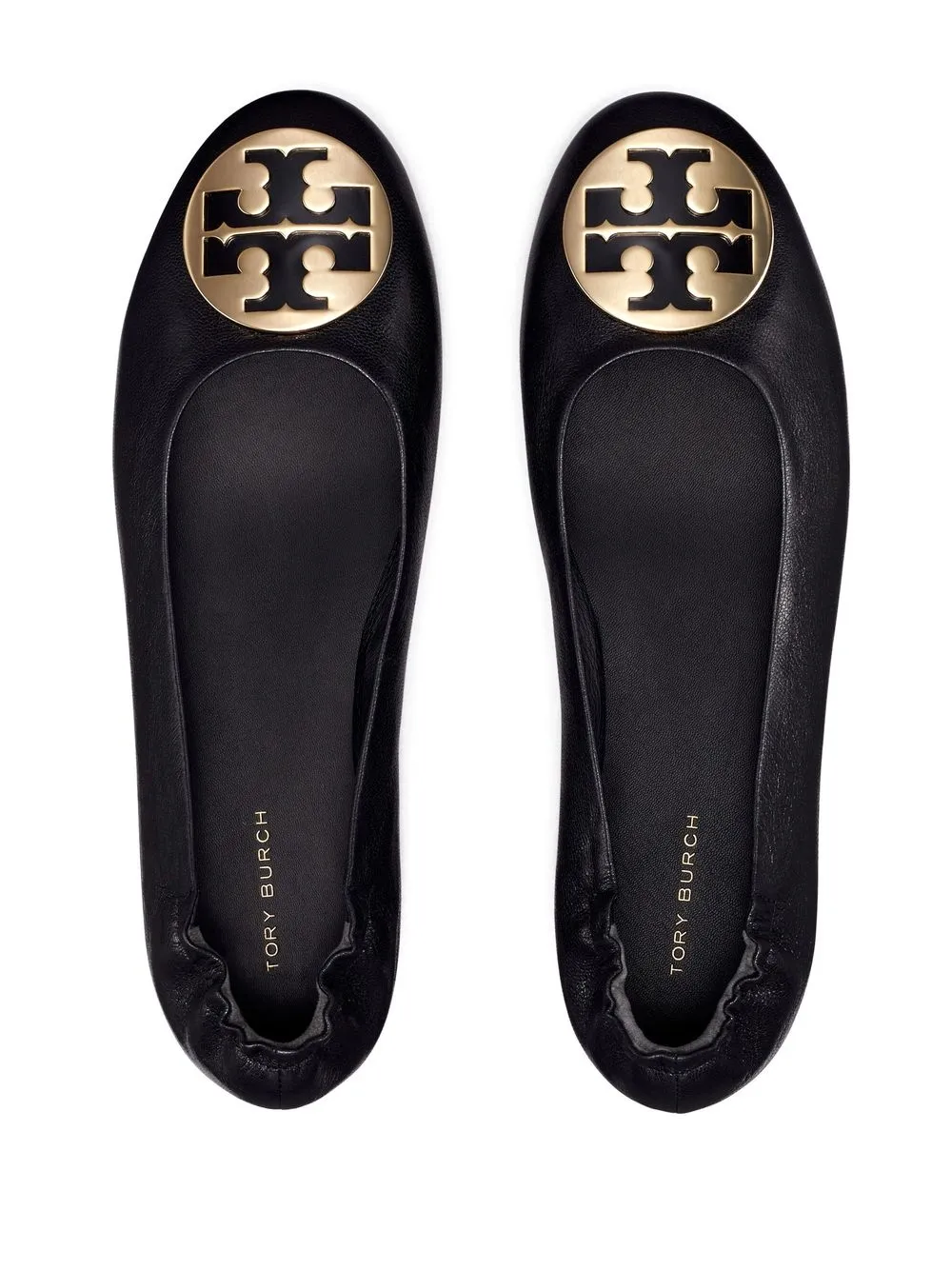 Claire leather ballerina shoes from TORY BURCH featuring black, nappa leather, branded leather insole, logo plaque, almond toe, slip-on style and flat rubber sole.