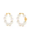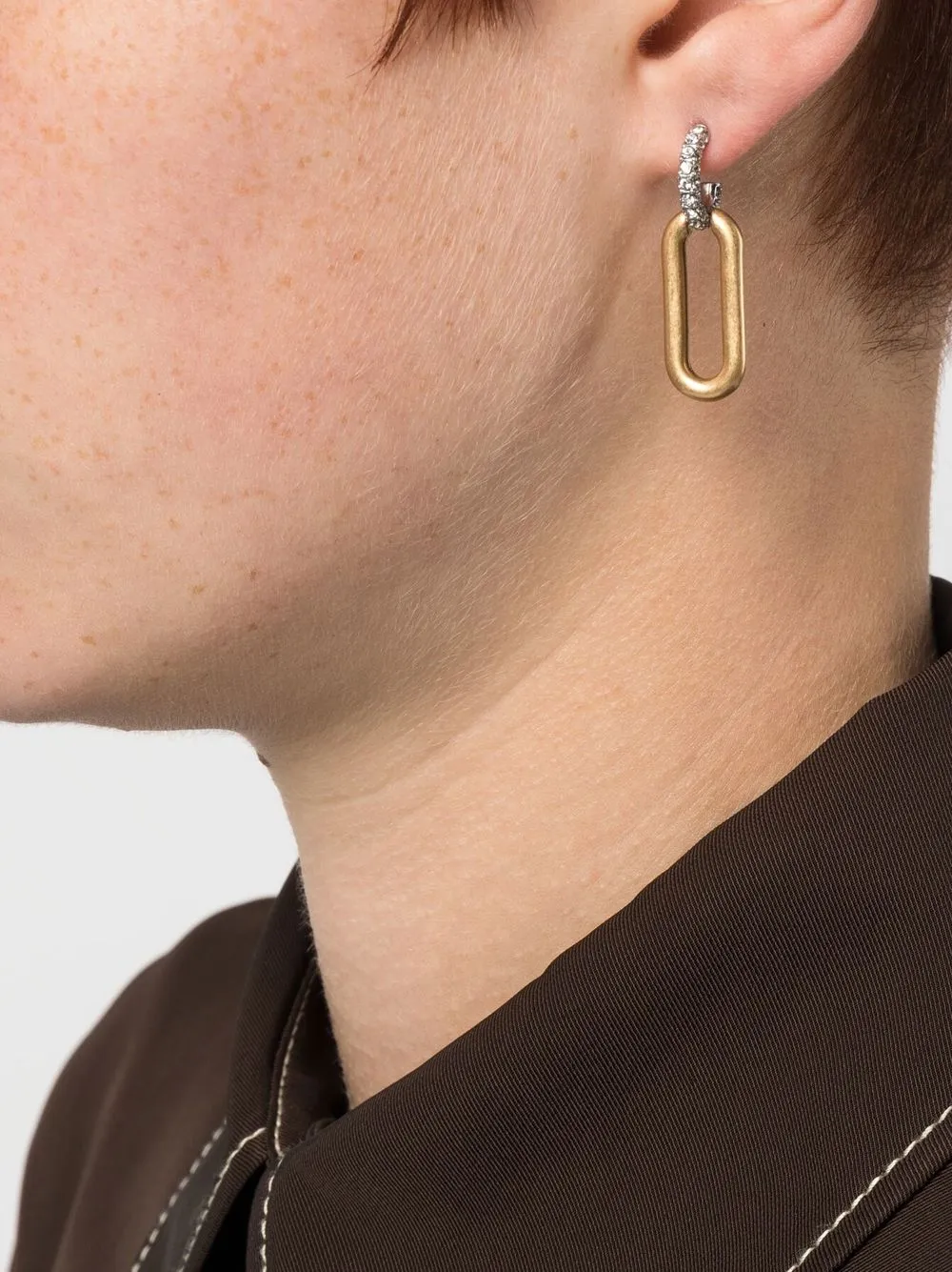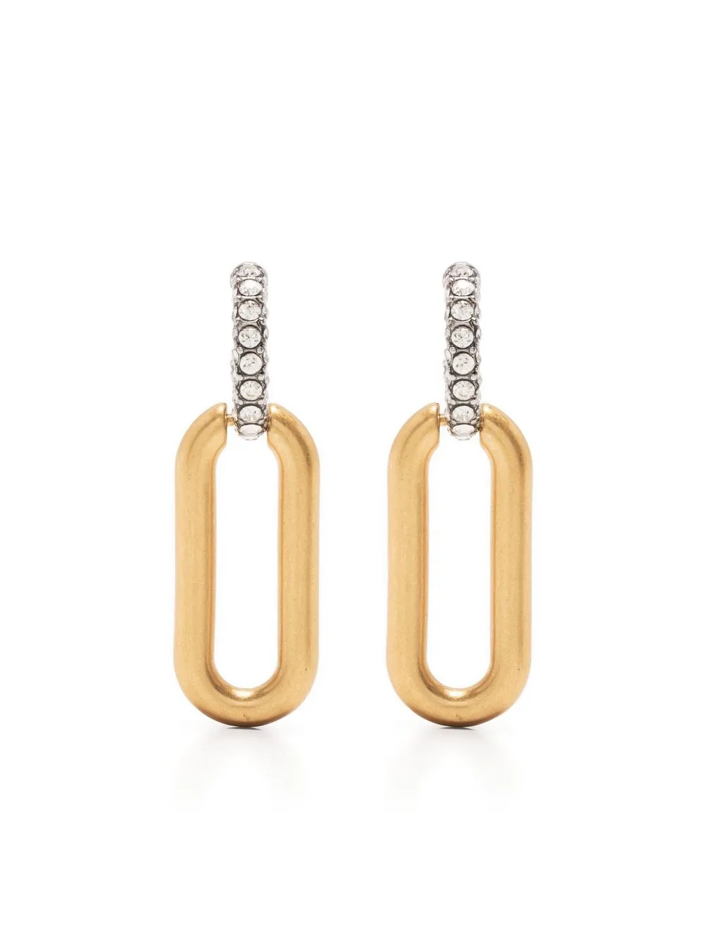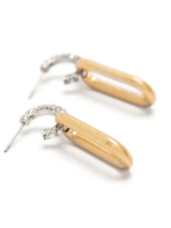 crystal-embellished long hoop earrings from TORY BURCH featuring gold-tone, silver-tone, brass, two-tone design, crystal embellishment, elongated hoop design and for pierced ears. These earrings come as a pair..