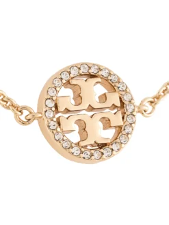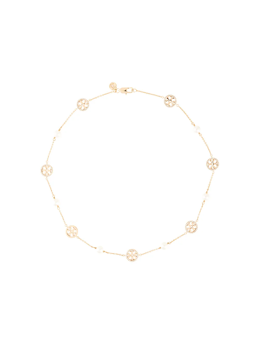 A contemporary classic, this chic gold-tone brass and glass crystal pearl logo necklace from Tory Burch is elegant and versatile. Featuring a cable chain, a lobster claw fastening and signature double T charms.