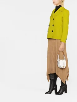 Designed by Tory Burch, this dark chartreuse-hued jacket nods to a tailored aesthetic thanks to its double-breasted design and wool fabrication.