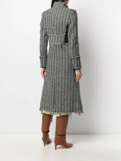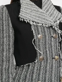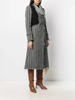 Grey/black wool blend double-breasted raw-cut coat from TORY BURCH featuring panelled design, raw-cut finish, notched lapels, double-breasted button fastening, knee-length and long sleeves.
