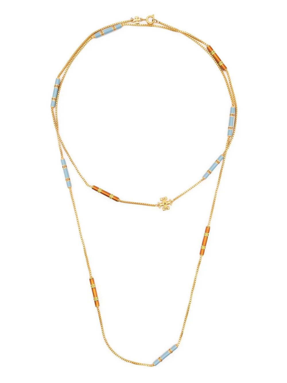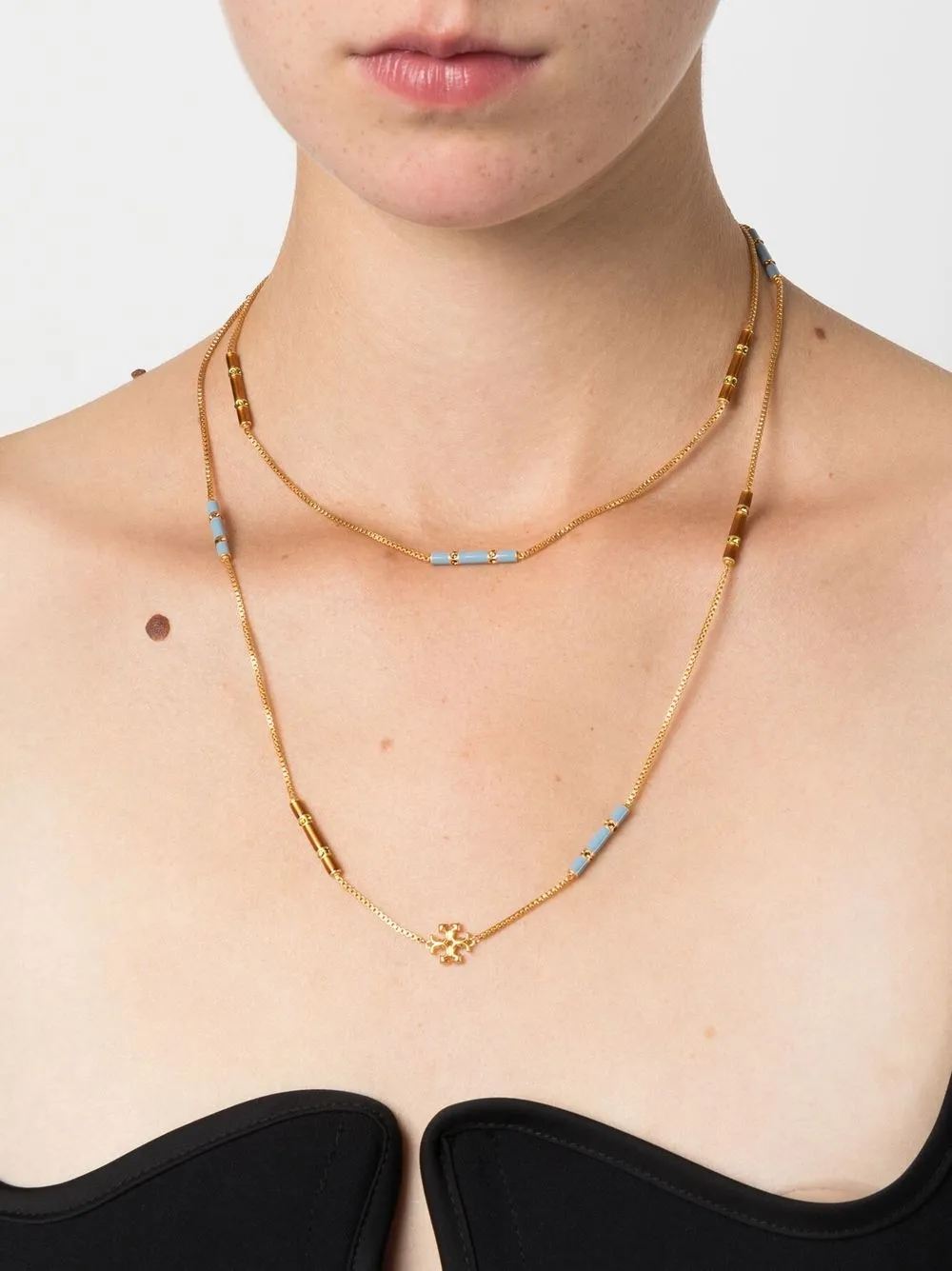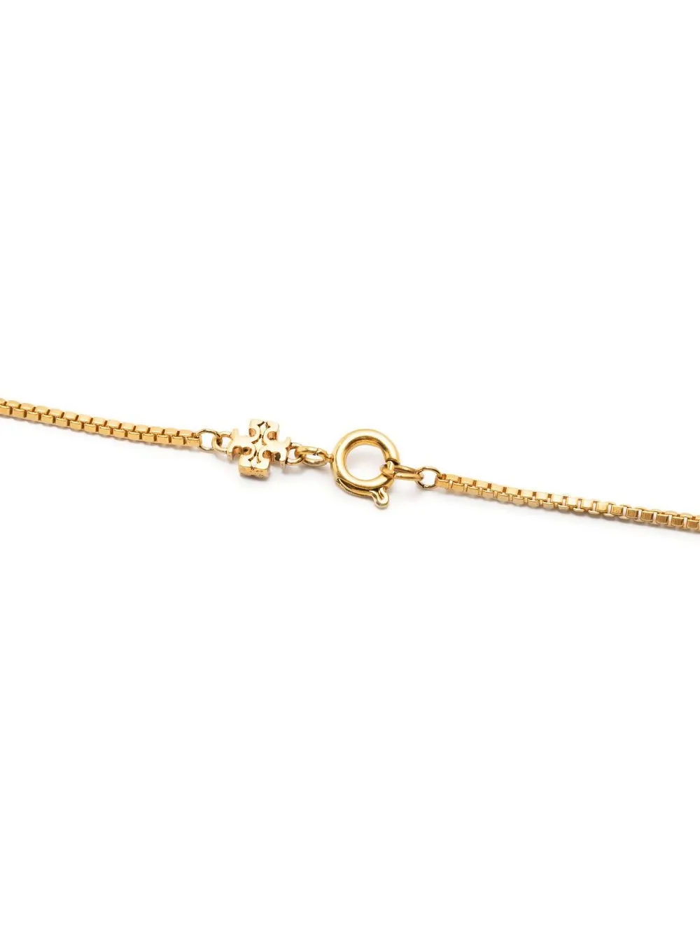 double-chain logo-charm necklace from TORY BURCH featuring gold-tone, brass, logo charm, enamel detail, crystal embellishment, clasp fastening and double chain design.