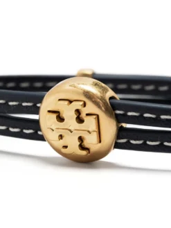 Tory Burch’s bracelet spotlights the brand’s iconic Double T motif. The emblem features on circular gold-tone charms that pop against the navy leather.