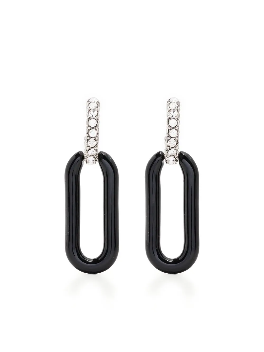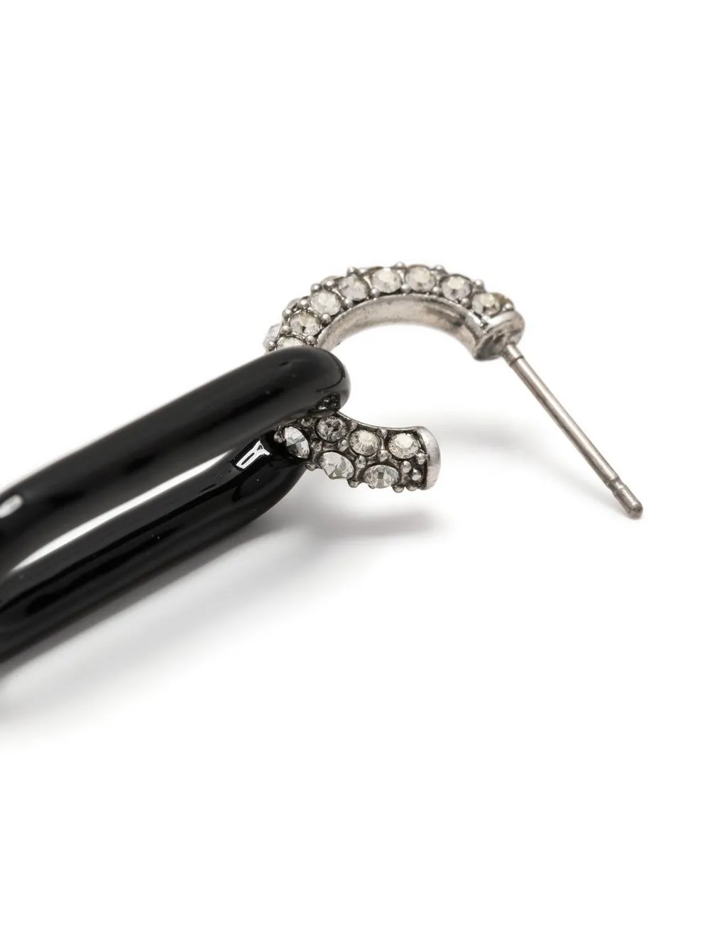 Double T pavé-crystal hoops from TORY BURCH featuring silver-tone, black, silver plated, small hoop design, signature Double T motif, pavé setting, crystal embellishment, engraved logo, enamel detail, for pierced ears and hinge closure. These earrings come as a pair..