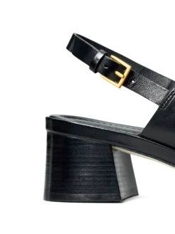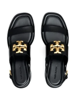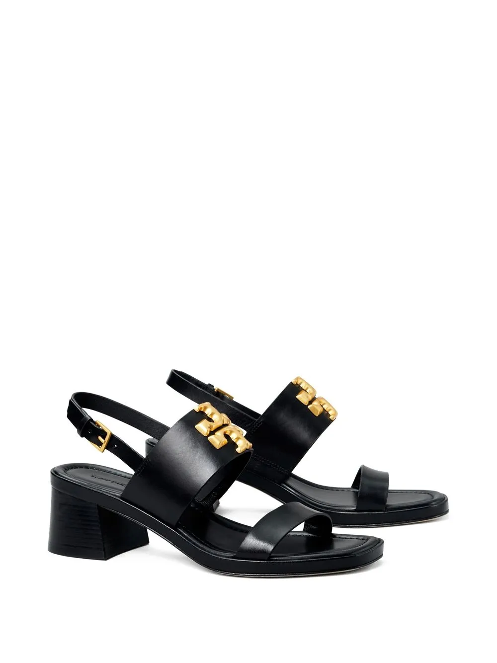 Eleanor 60mm logo-plaque sandals from TORY BURCH featuring black, leather, branded leather insole, logo plaque, open toe, single toe strap, buckle-fastening ankle strap and mid block heel.