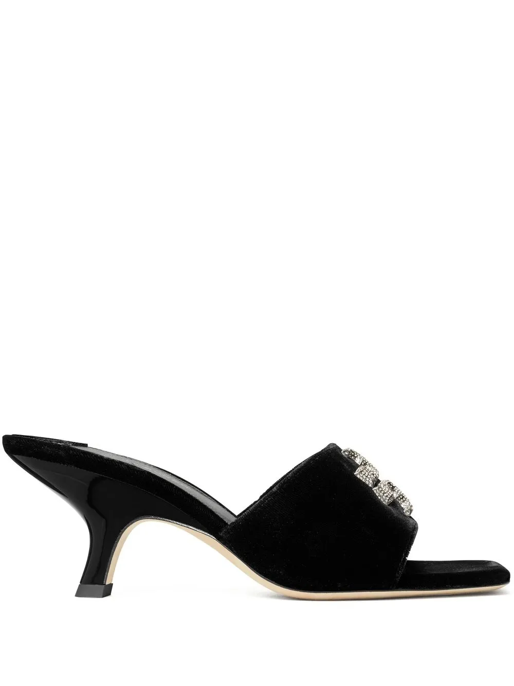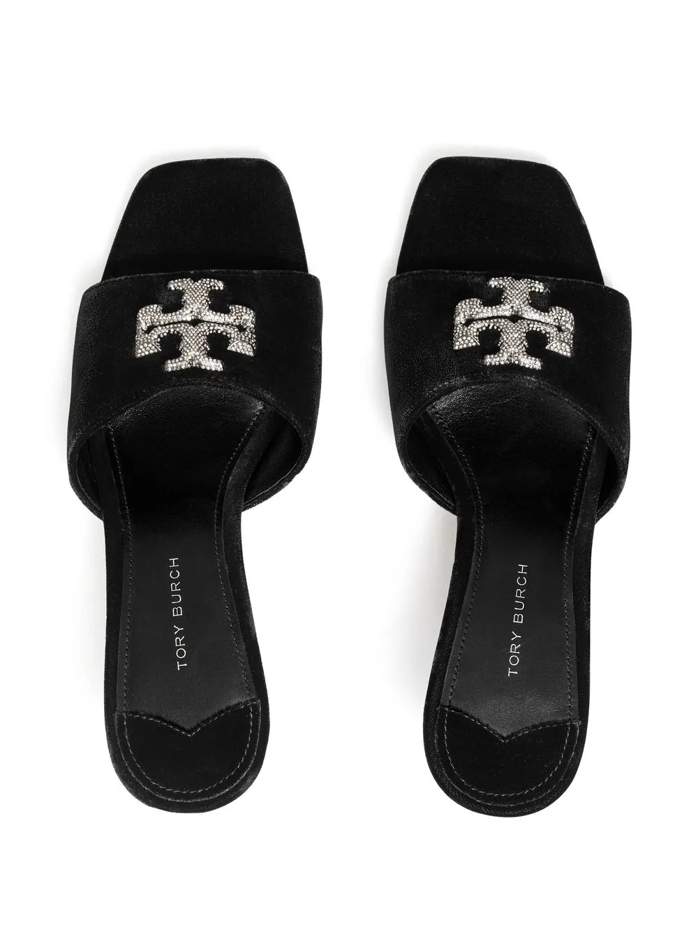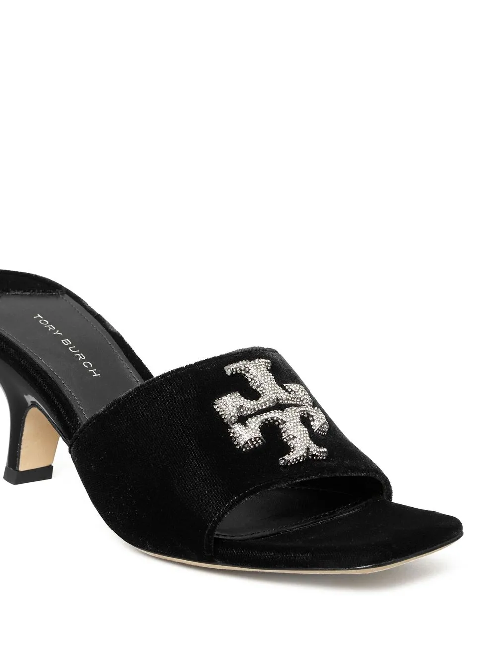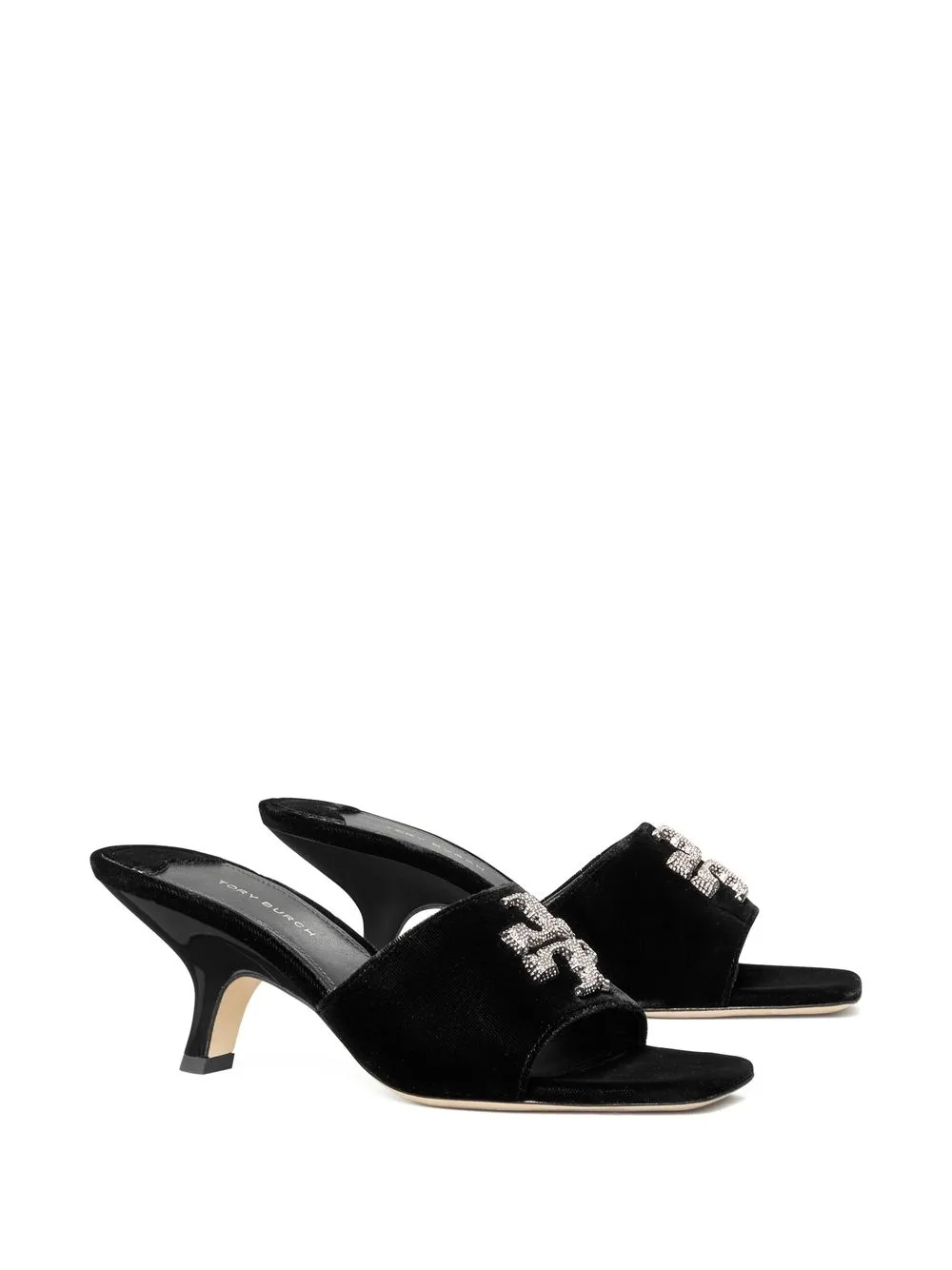 Eleanor diamante-logo 65mm mules from TORY BURCH featuring black, velvet, leather, gem-logo detailing, open toe, square toe, open back, slip-on style, lacquered finish and branded leather insole.