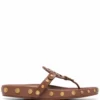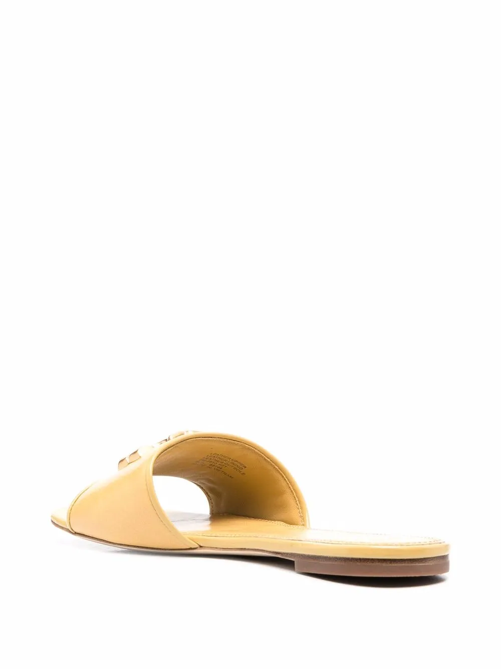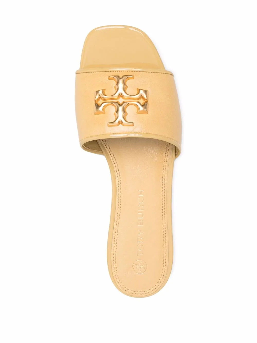 Yellow leather Eleanor Double T logo slides from TORY BURCH featuring square toe, branded insole, flat sole and Double T logo.