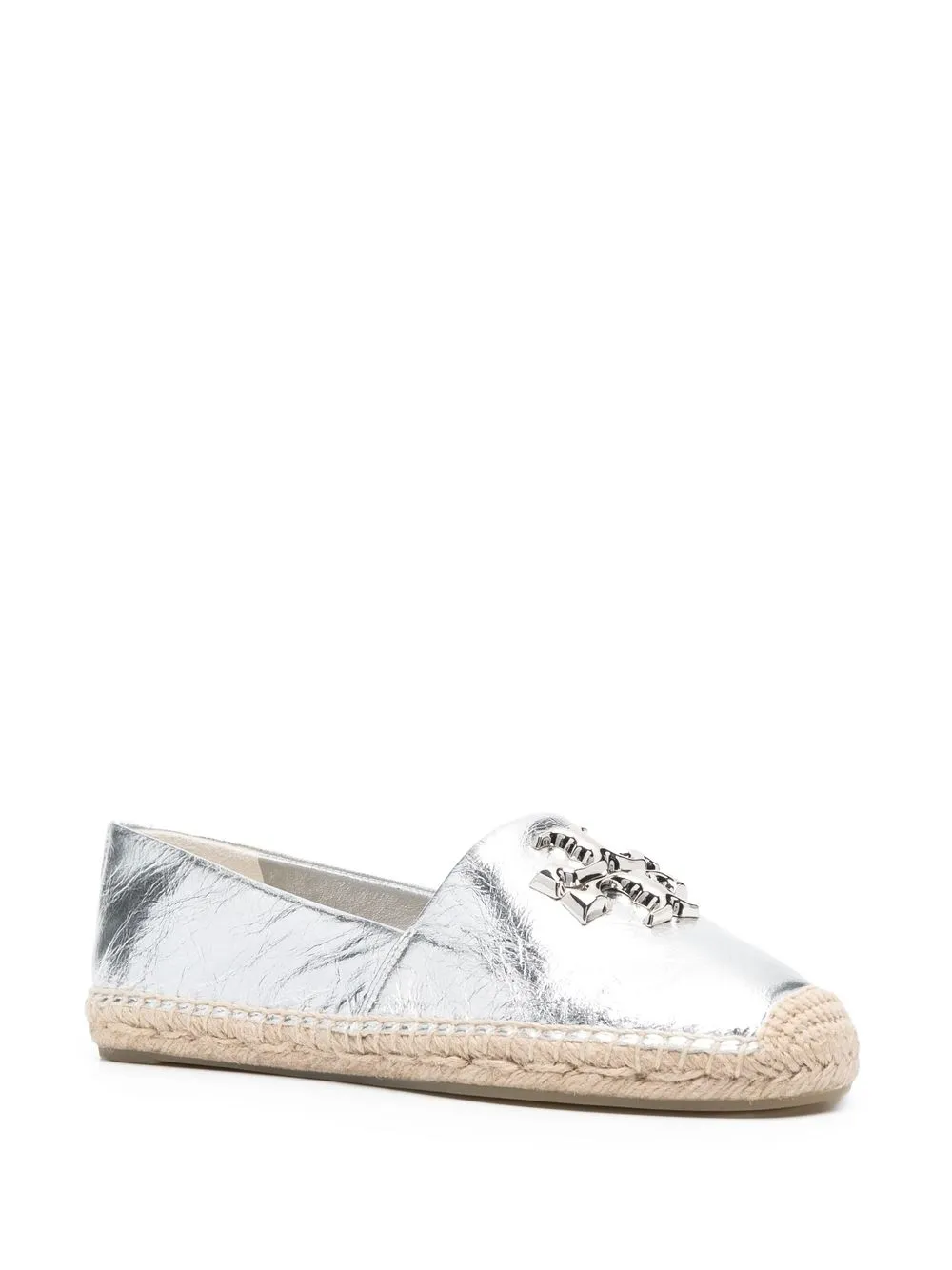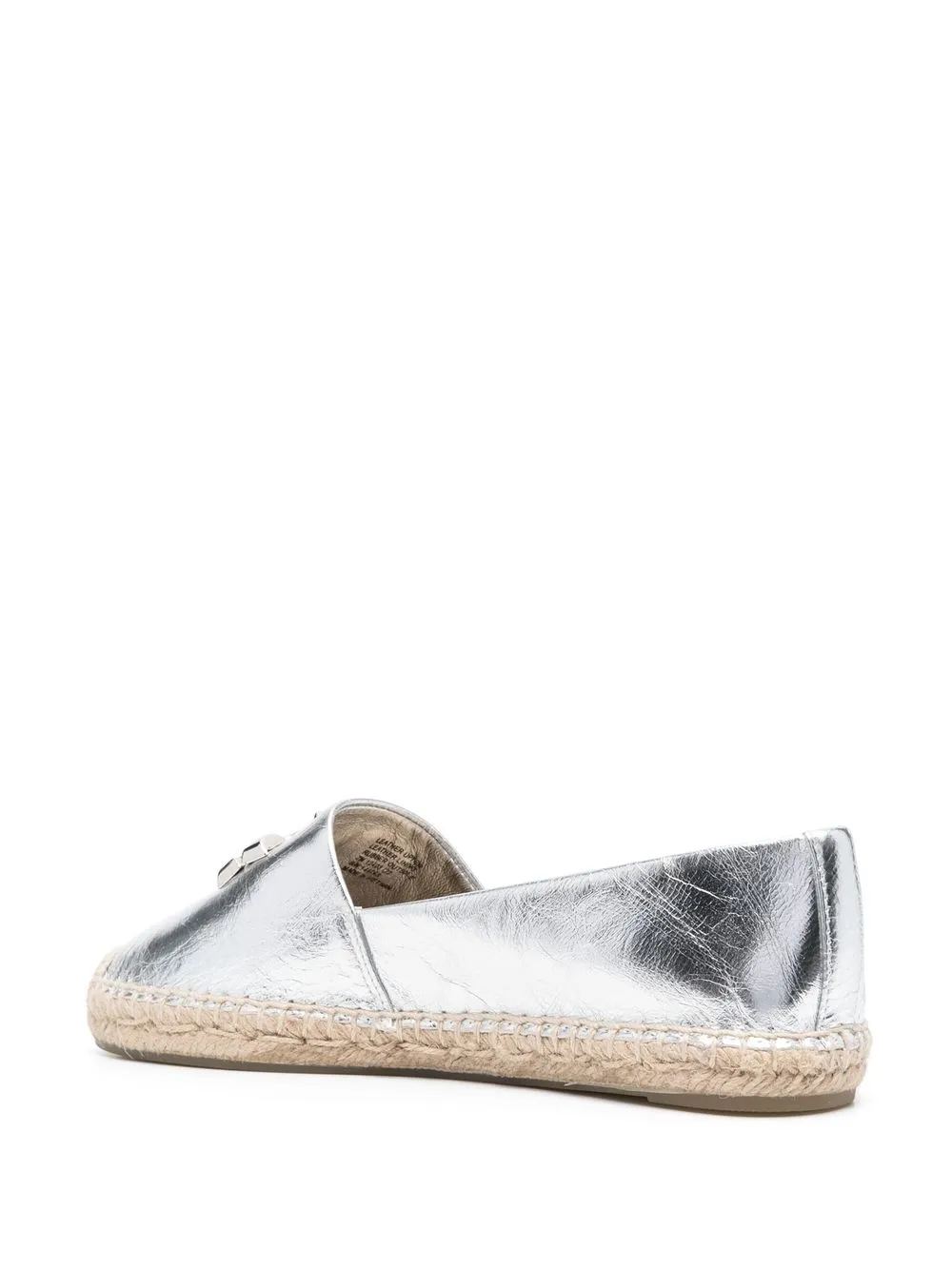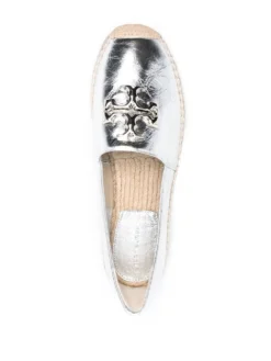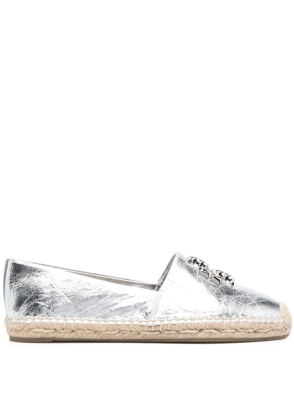 metallic-effect espadrilles from TORY BURCH featuring silver-tone, calf leather, metallic effect, silver-tone logo plaque, round toe, branded insole, braided raffia sole and rubber outsole.