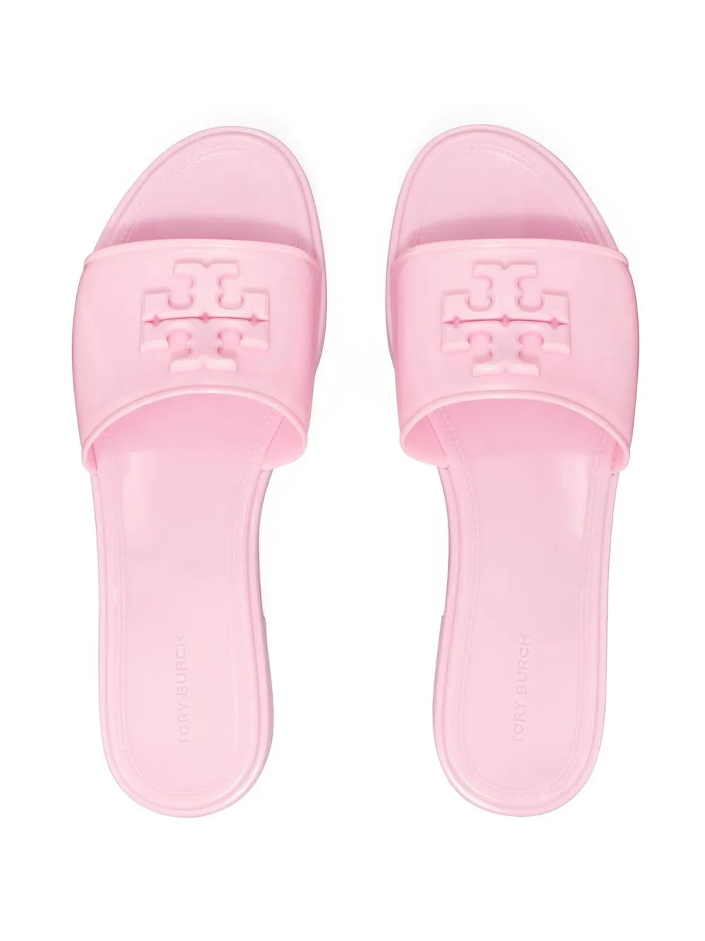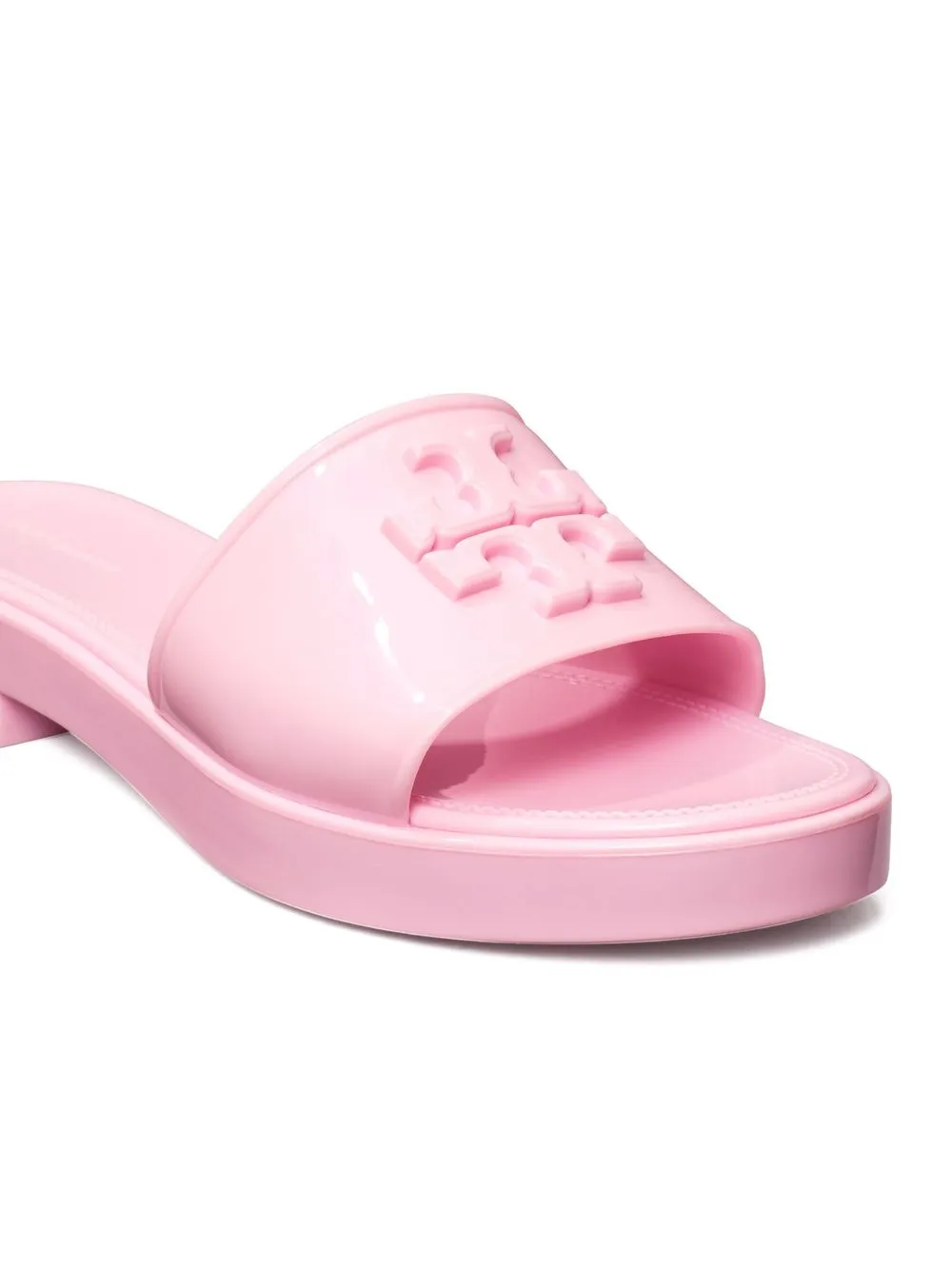 Eleanor jelly slides from TORY BURCH featuring light pink, embossed logo to the front, signature Double T motif, open toe, slip-on style and flat rubber sole.