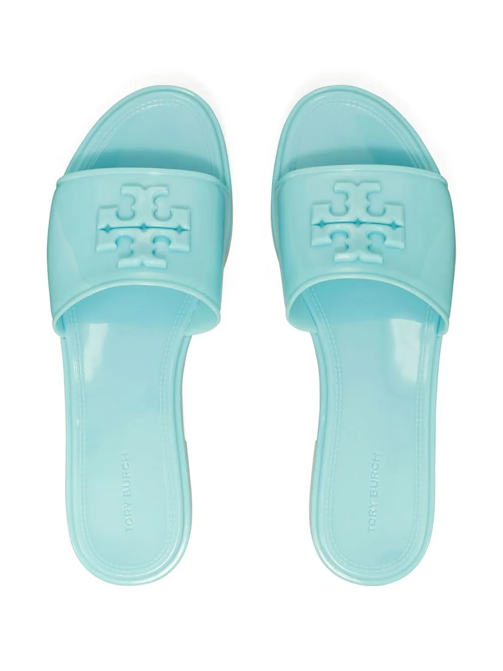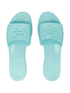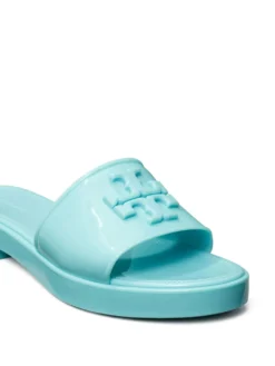 Eleanor jelly slides from TORY BURCH featuring light blue, logo plaque, open toe, single toe strap and low heel.