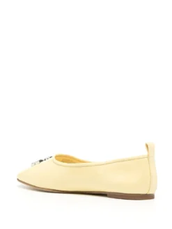 Eleanor logo-plaque ballerina from TORY BURCH featuring light yellow, leather, patent finish, signature Double T motif, silver-tone logo plaque, round toe, pull-tab at the heel and flat rubber sole.