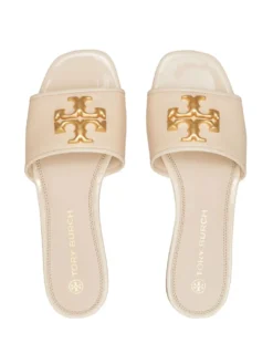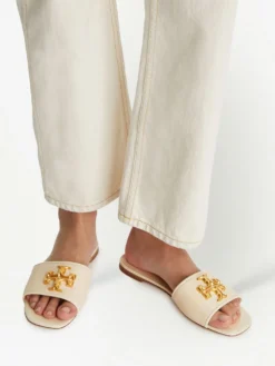 Tory Burch’s Eleanor slides showcase the brand’s signature Double T logo plaque in striking gold-tone hardware. Fabricated from cream leather, the open-toe design features a comfortable flat leather outsole and soft branded insole.