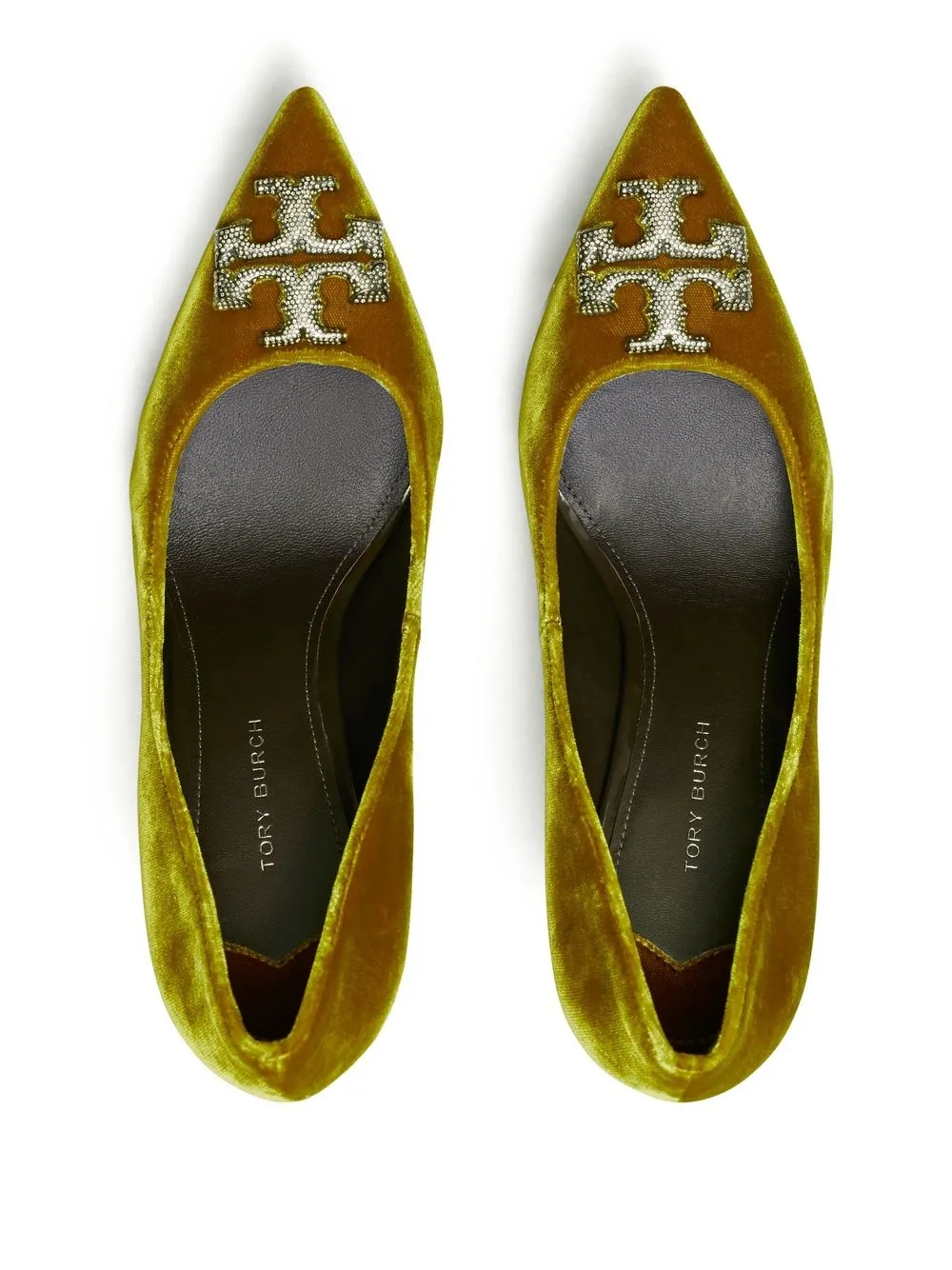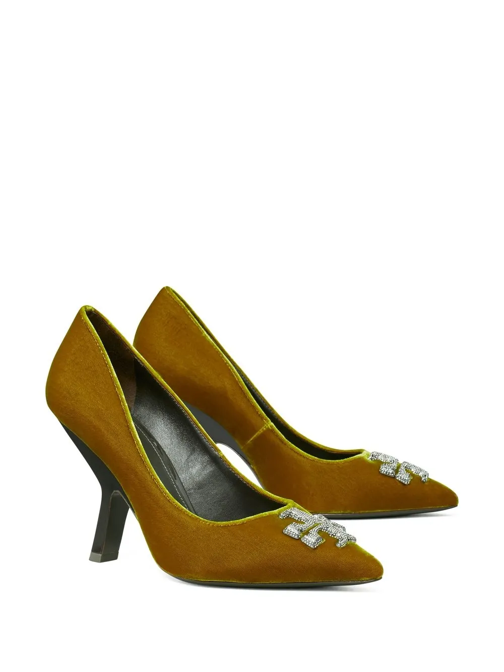 Eleanor Pave 100mm pump from TORY BURCH featuring caramel brown, calf leather, velvet, iridescent trim, signature Double T motif, crystal embellishment, pointed toe, cushioned insole and high sculpted heel.