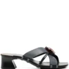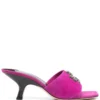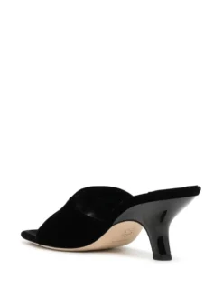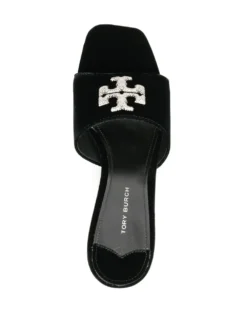 Eleanor Pavé 40mm suede mules from TORY BURCH featuring black, leather, suede, signature Double T motif, open toe, square toe, slip-on style and low sculpted heel.