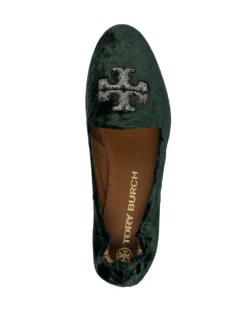 Emerald green velvet Eleanor velvet loafers from TORY BURCH featuring signature Double T motif, branded leather insole, elasticated trim, almond toe, slip-on style, flat leather sole and small interior wedge.
