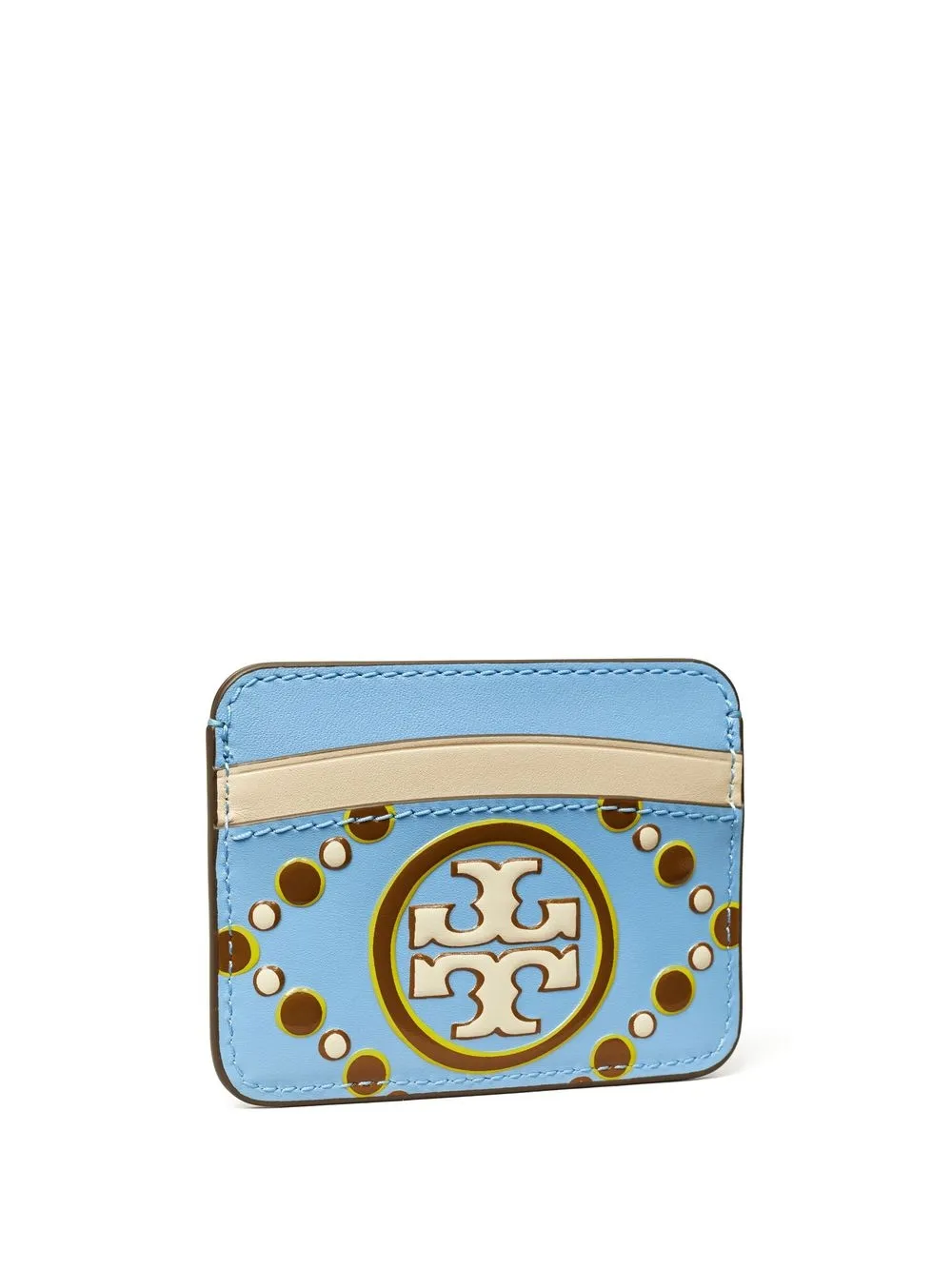 embossed-logo cardholder from TORY BURCH featuring leather, all-over embossed logo print, single card slot and light blue/ burgundy/ beige.