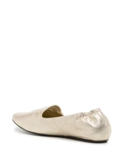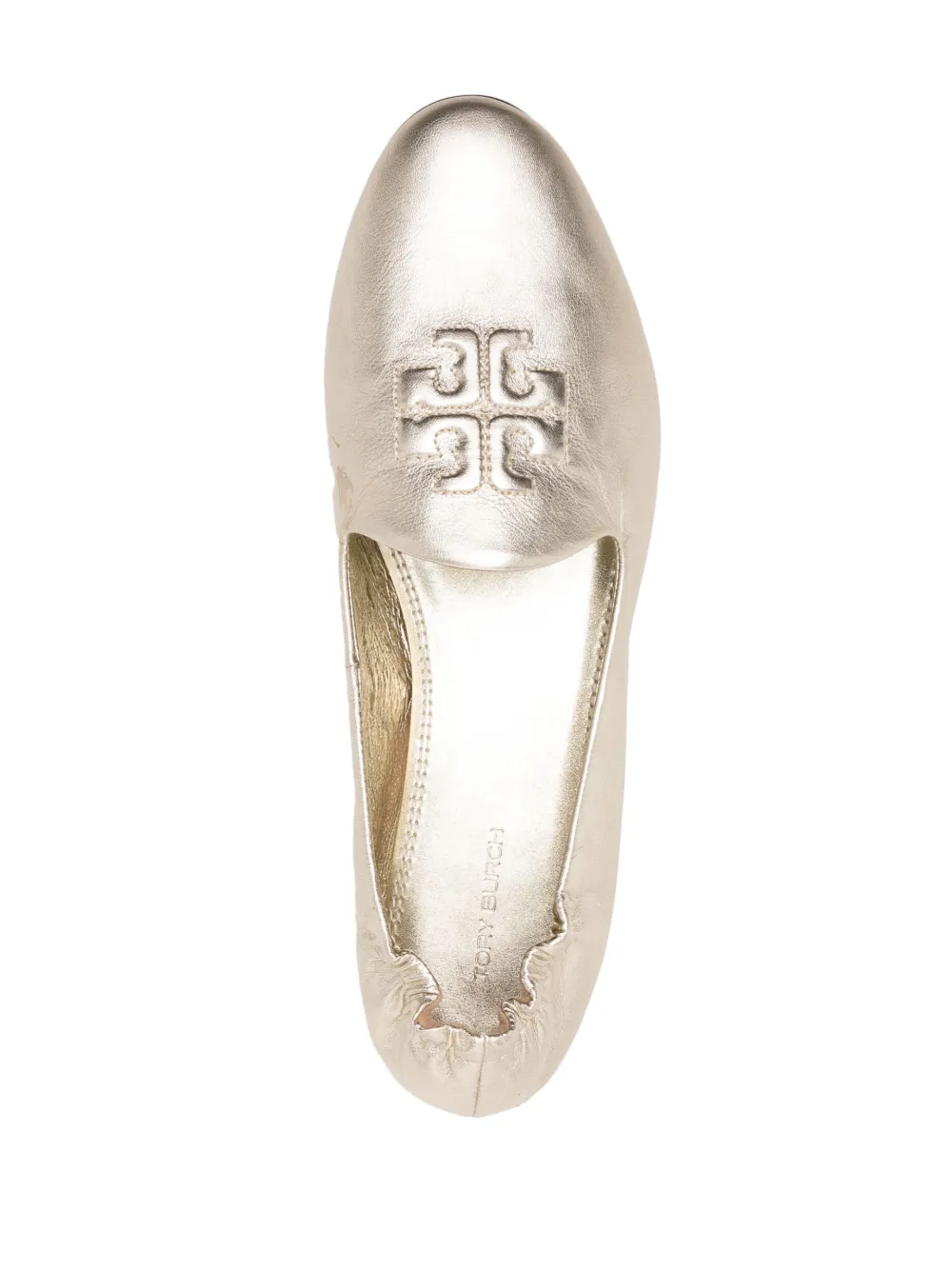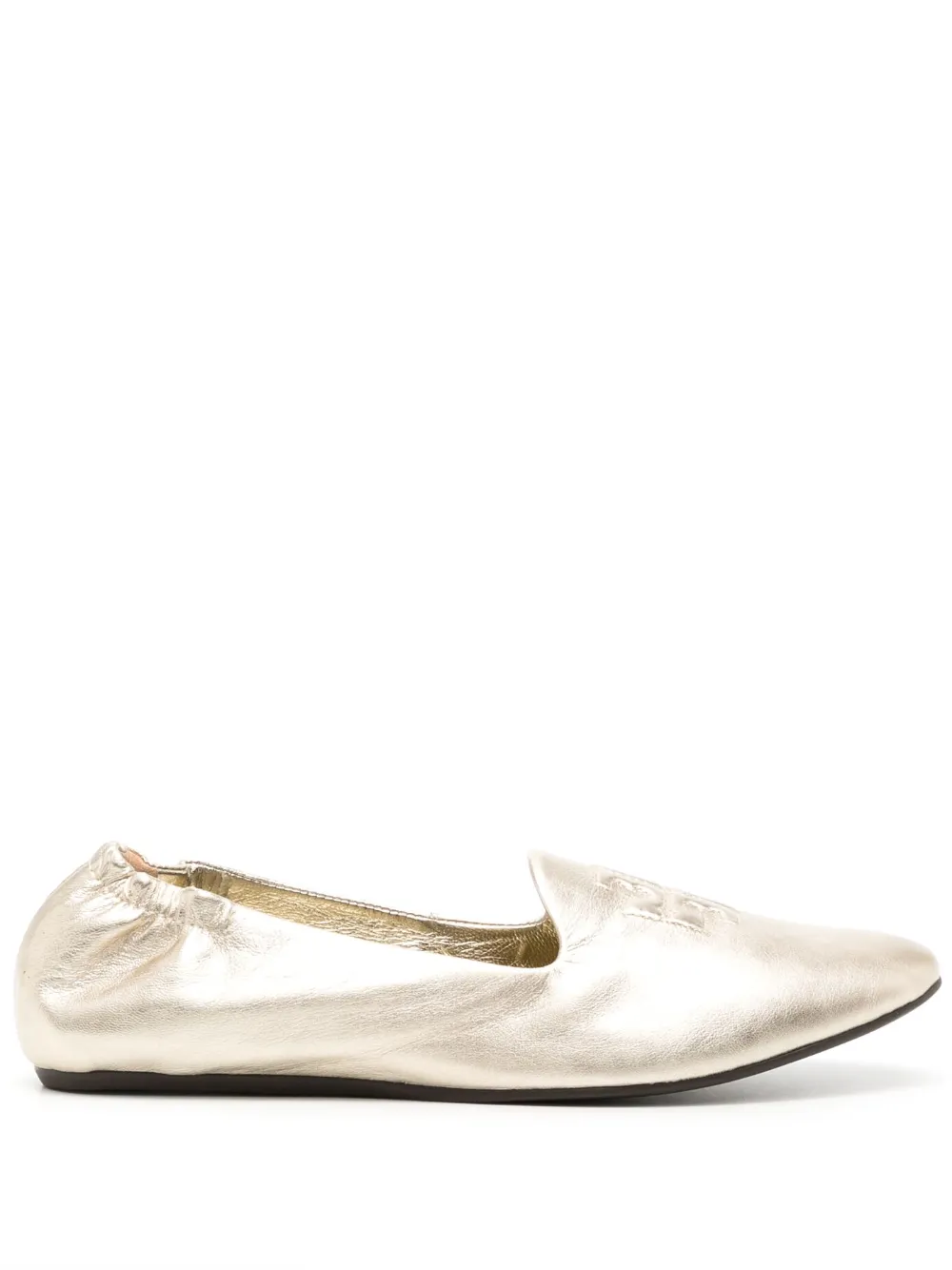 embossed-logo leather slippers from TORY BURCH featuring gold-tone, leather, metallic finish, embossed logo to the front, elasticated trim, round toe, branded leather insole and flat rubber sole.