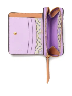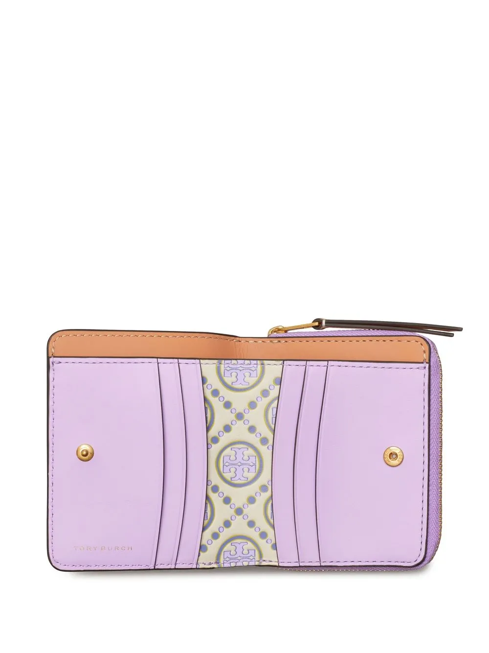 embossed-monogram bi-fold wallet from TORY BURCH featuring lavender purple, calf leather, embossed monogram pattern, bi-fold design, gold-tone hardware, top zip fastening, internal card slots and internal note compartments.