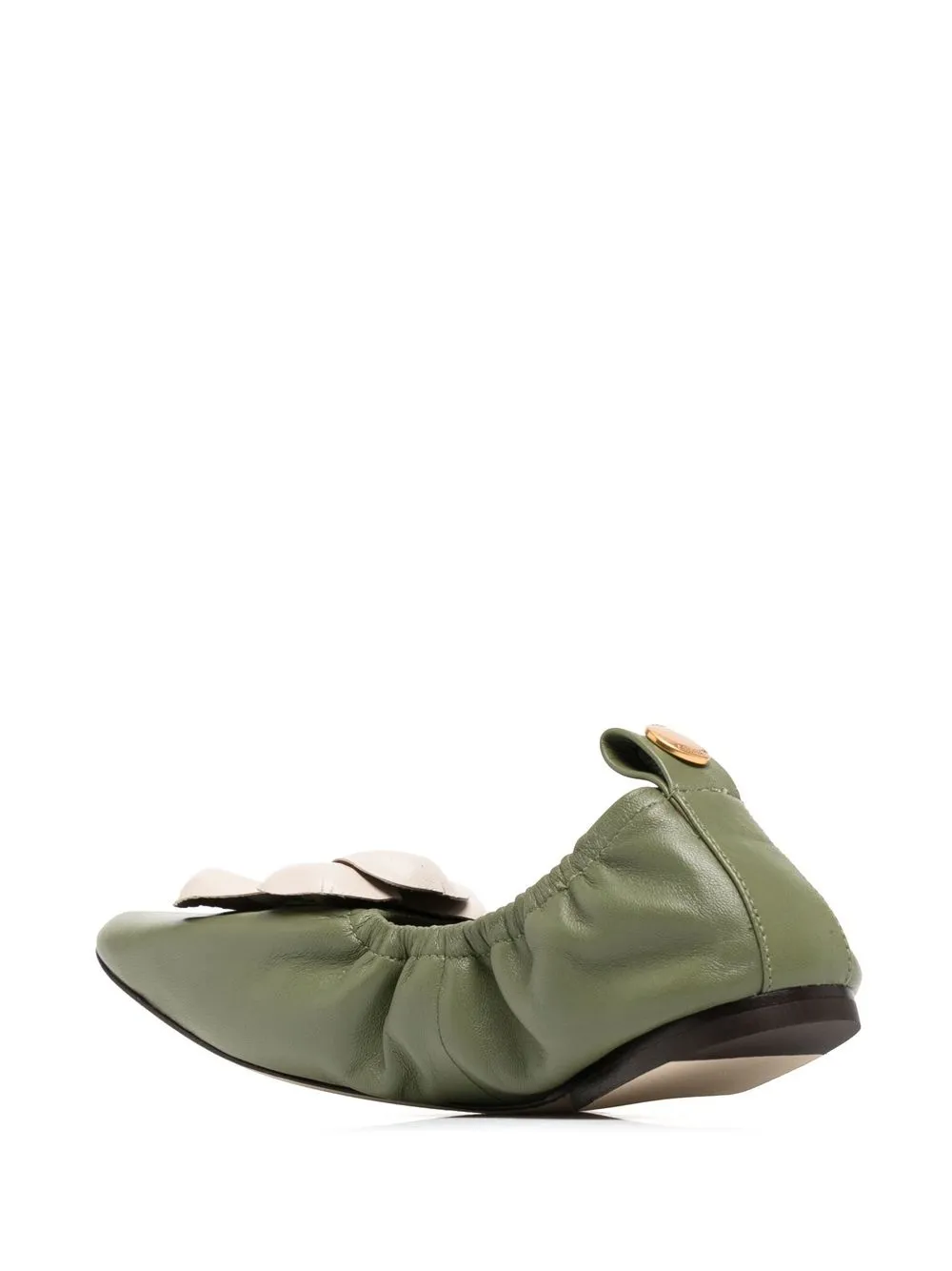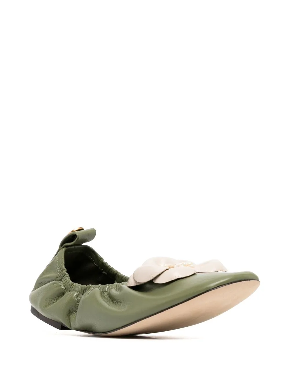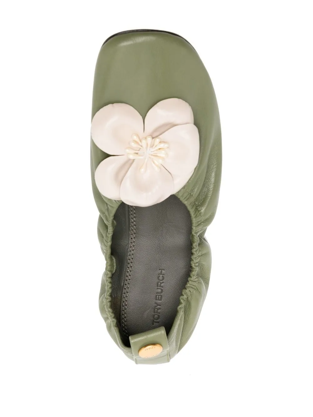 floral-embellished ballerina shoes from TORY BURCH featuring avocado green, leather, floral appliqué, square toe, elasticated trim and leather outsole.