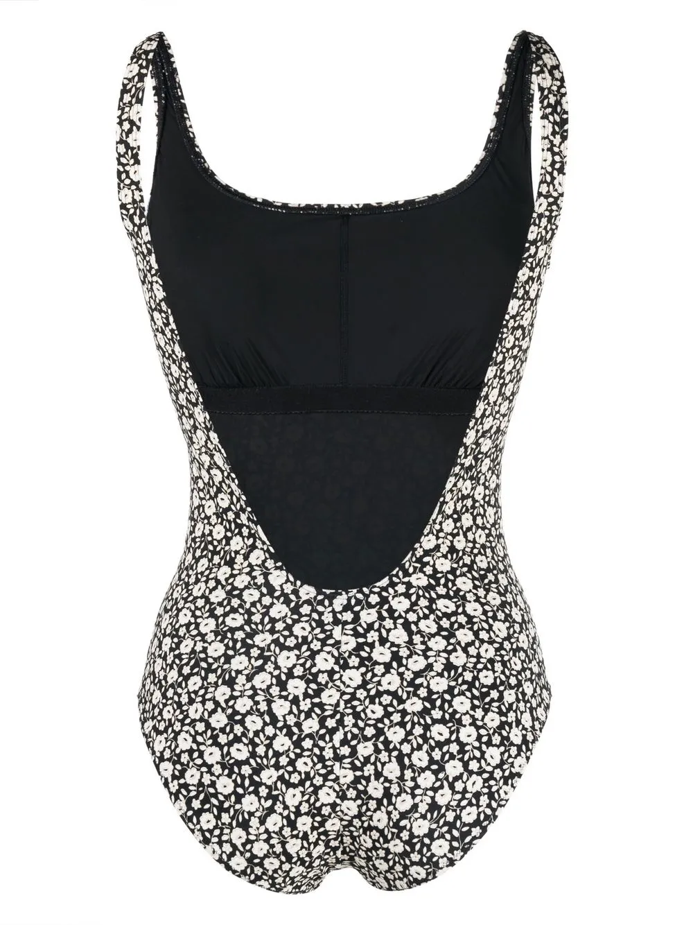 floral-print backless swimsuit from TORY BURCH featuring black/white, stretch-design, all-over floral print, U-neck, backless and sleeveless. Be mindful to try on swimwear over your own garments..