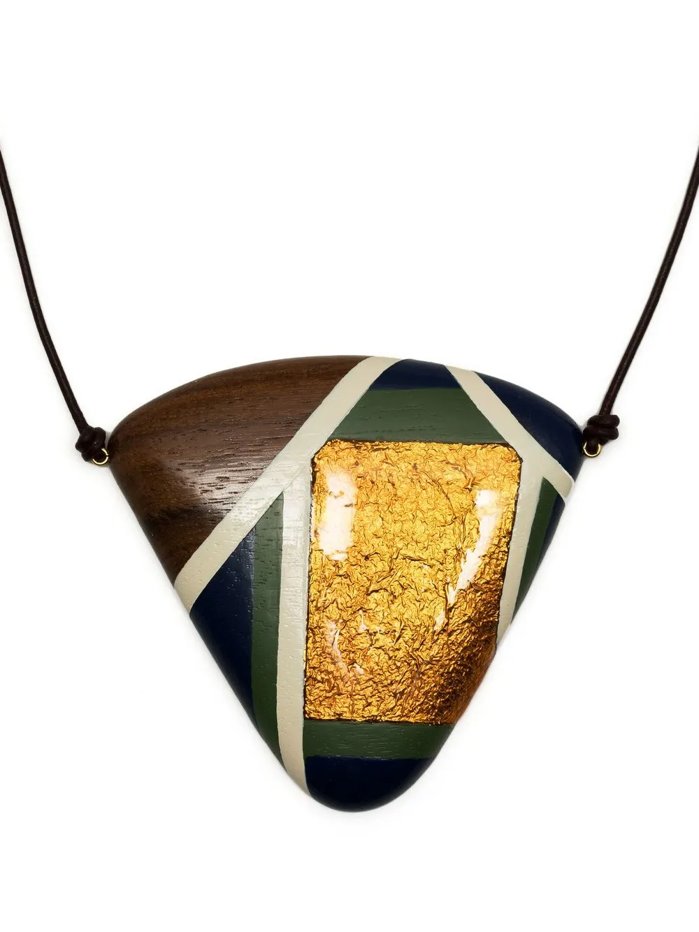 Geo wood pendant necklace from TORY BURCH featuring brown, multicolour, wood, statement pendant, geometric-pattern print, hook fastening, rope detailing and foil leaf.