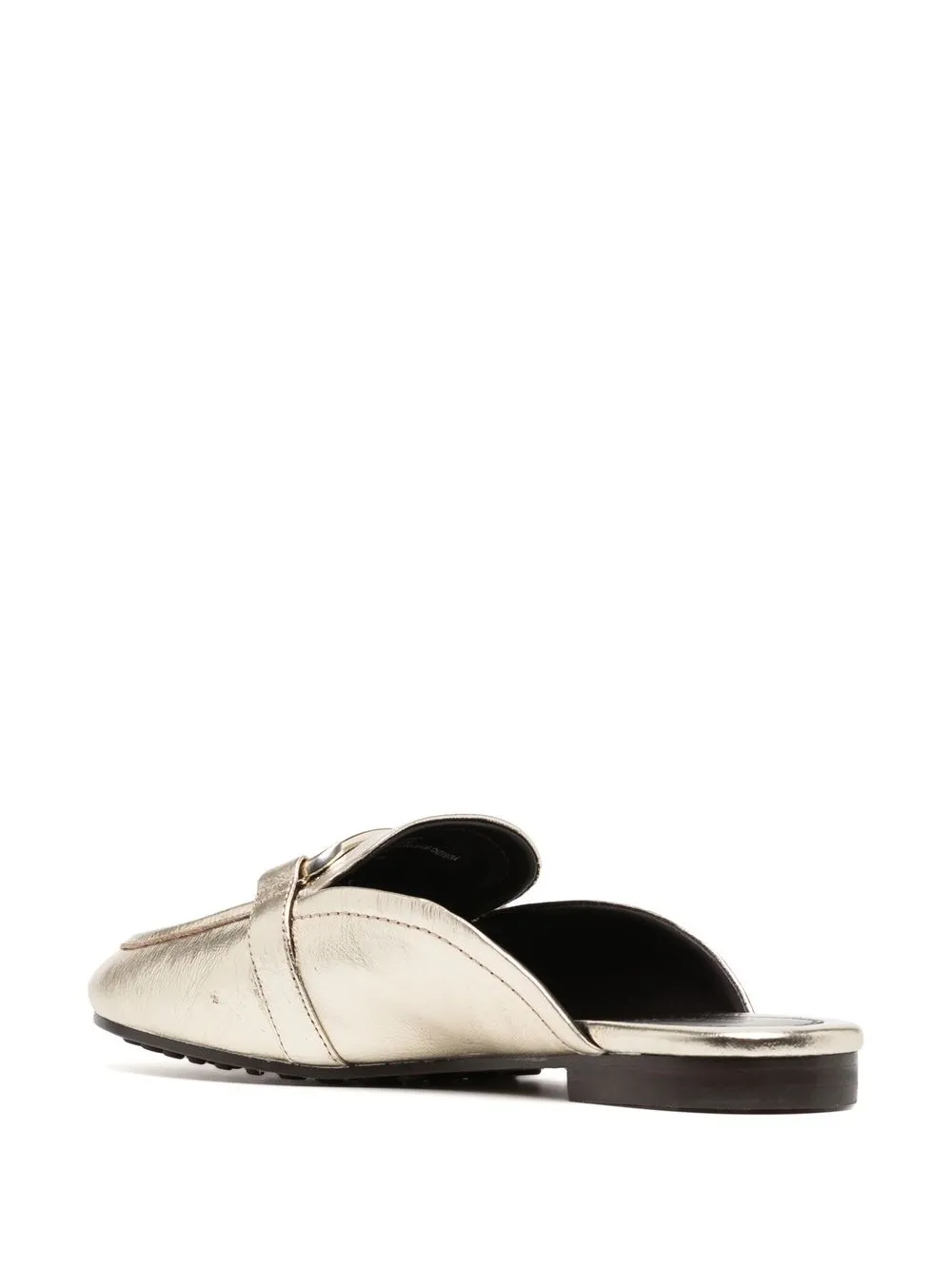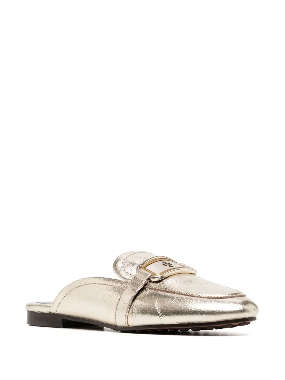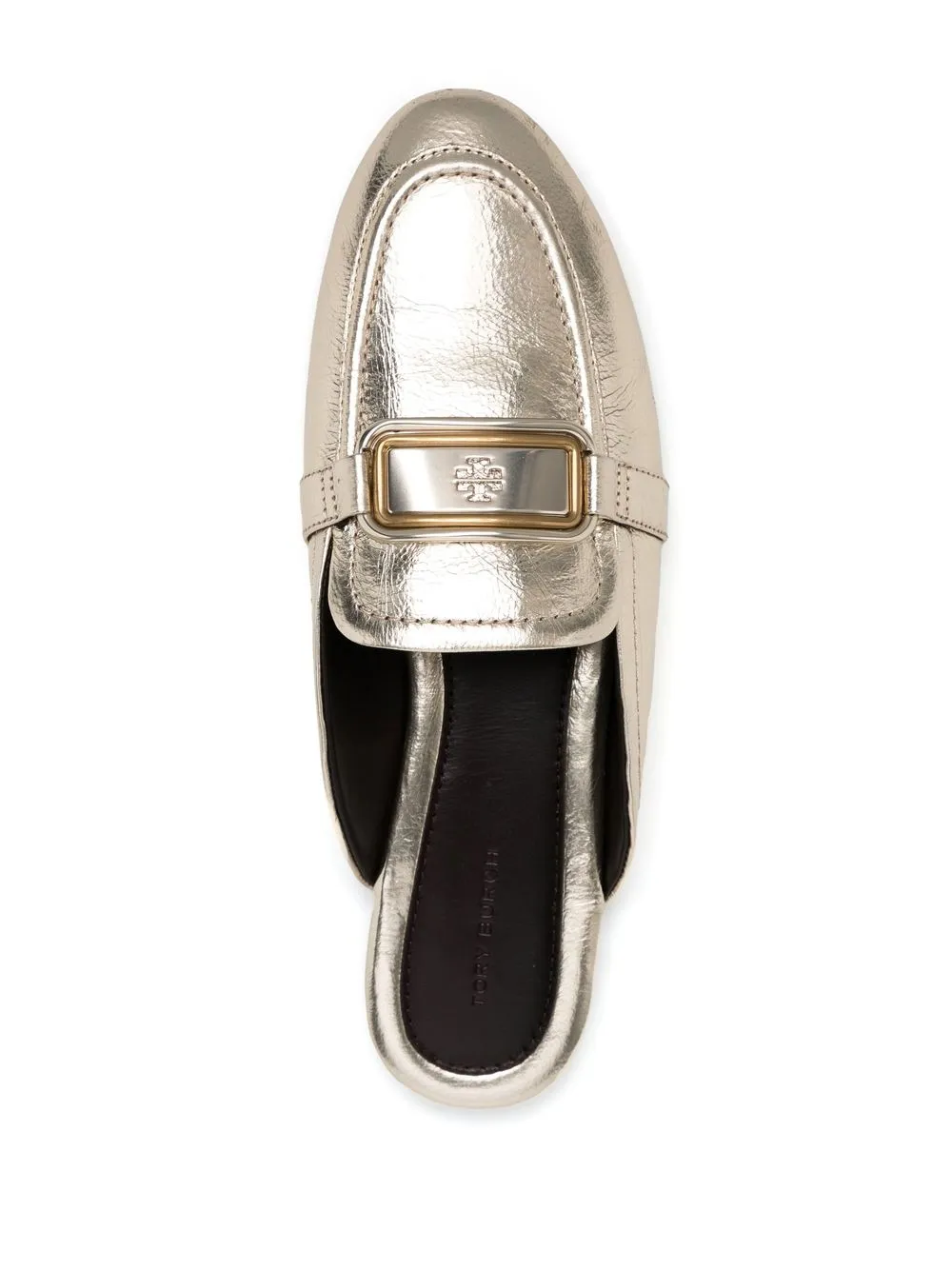 Georgia 10mm backless loafers from TORY BURCH featuring gold-tone, leather, metallic sheen, logo plaque, round toe, branded leather insole, low block heel and ridged rubber sole.
