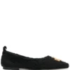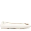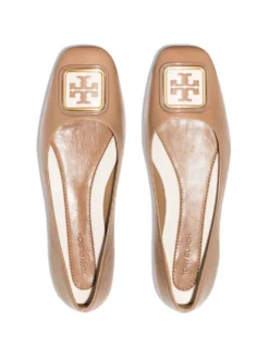 Tory Burch’s ballerina shoes spotlight the brand’s iconic Double T plaque. Crafted from almond-beige leather in a glossed finish, the square shape matches the square toe shape.