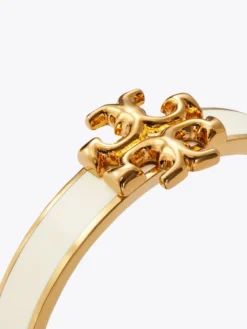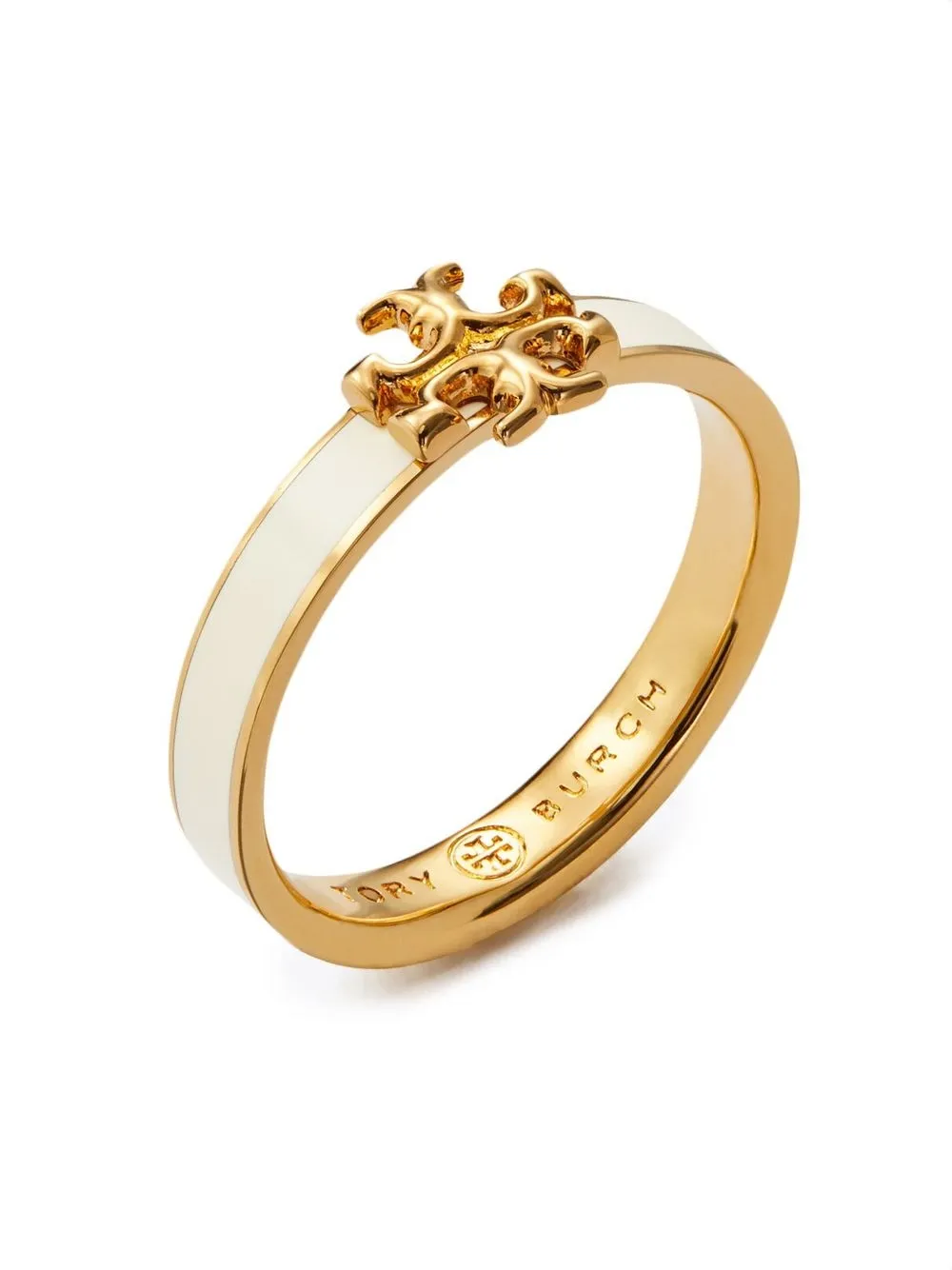 gold-plated logo ring from TORY BURCH featuring brass, 18kt gold plated, appliqué logo, engraved detail and gold-tone/ white.
