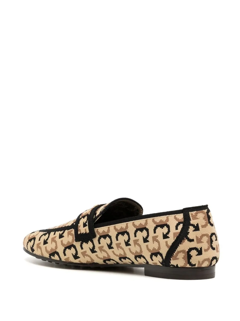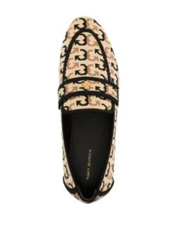 graphic-print ballet loafers from TORY BURCH featuring brown, flat rubber sole, all-over graphic print, almond toe and gold-tone logo plaque.
