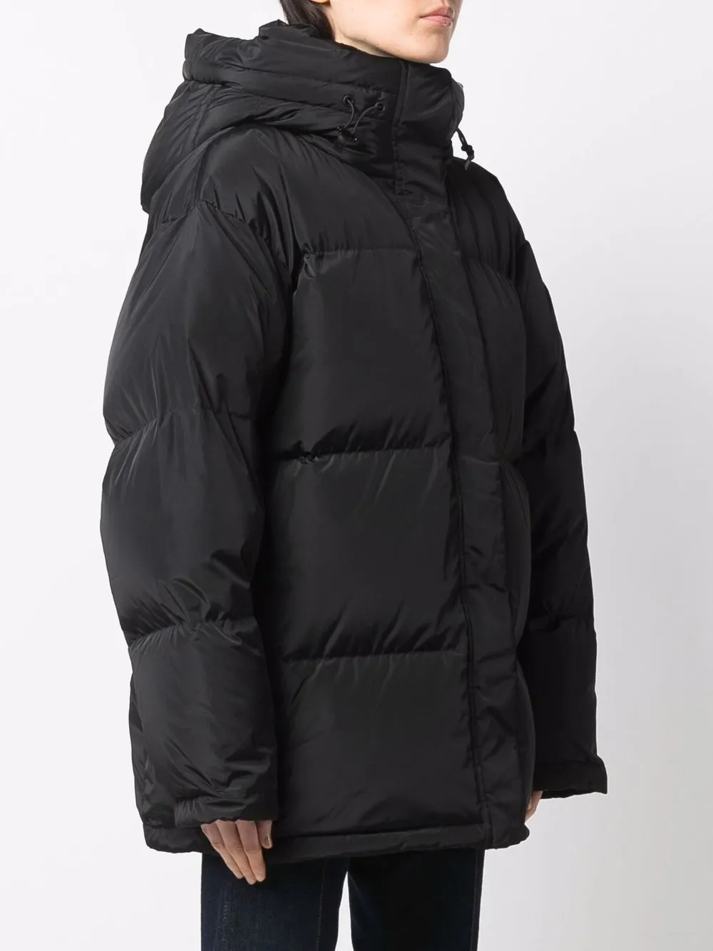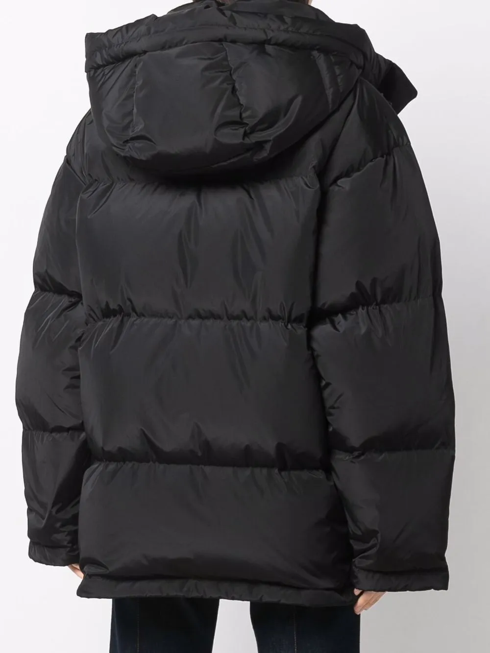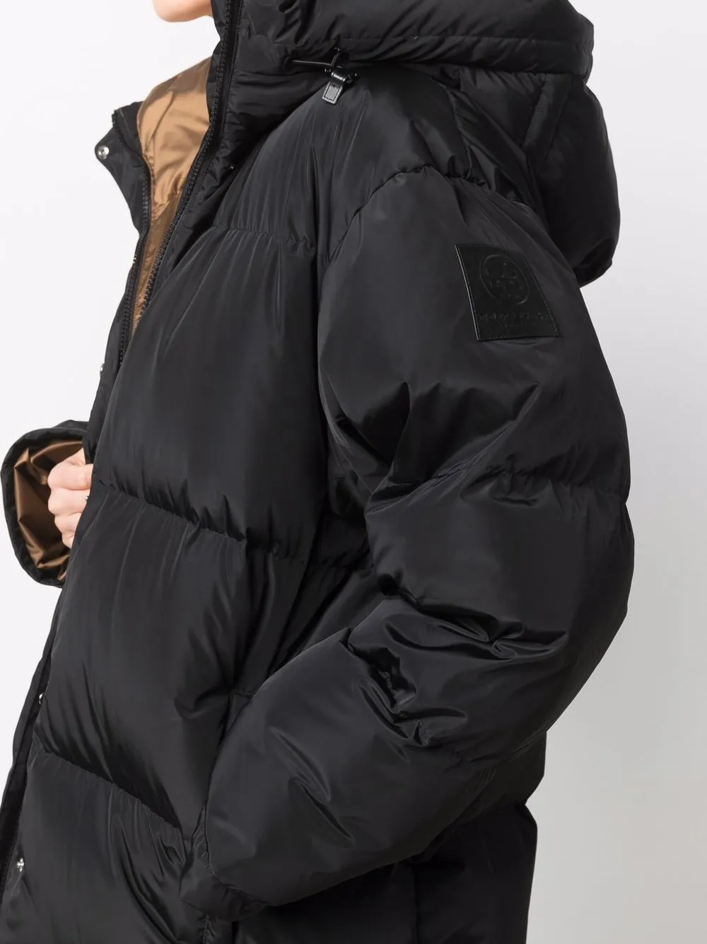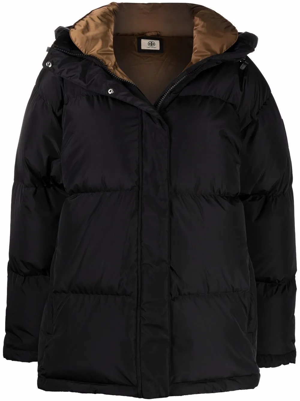 Black hooded down-padded coat from TORY BURCH featuring down-feather filling, classic hood, front press-stud and zip fastening, long sleeves and oversize frame.