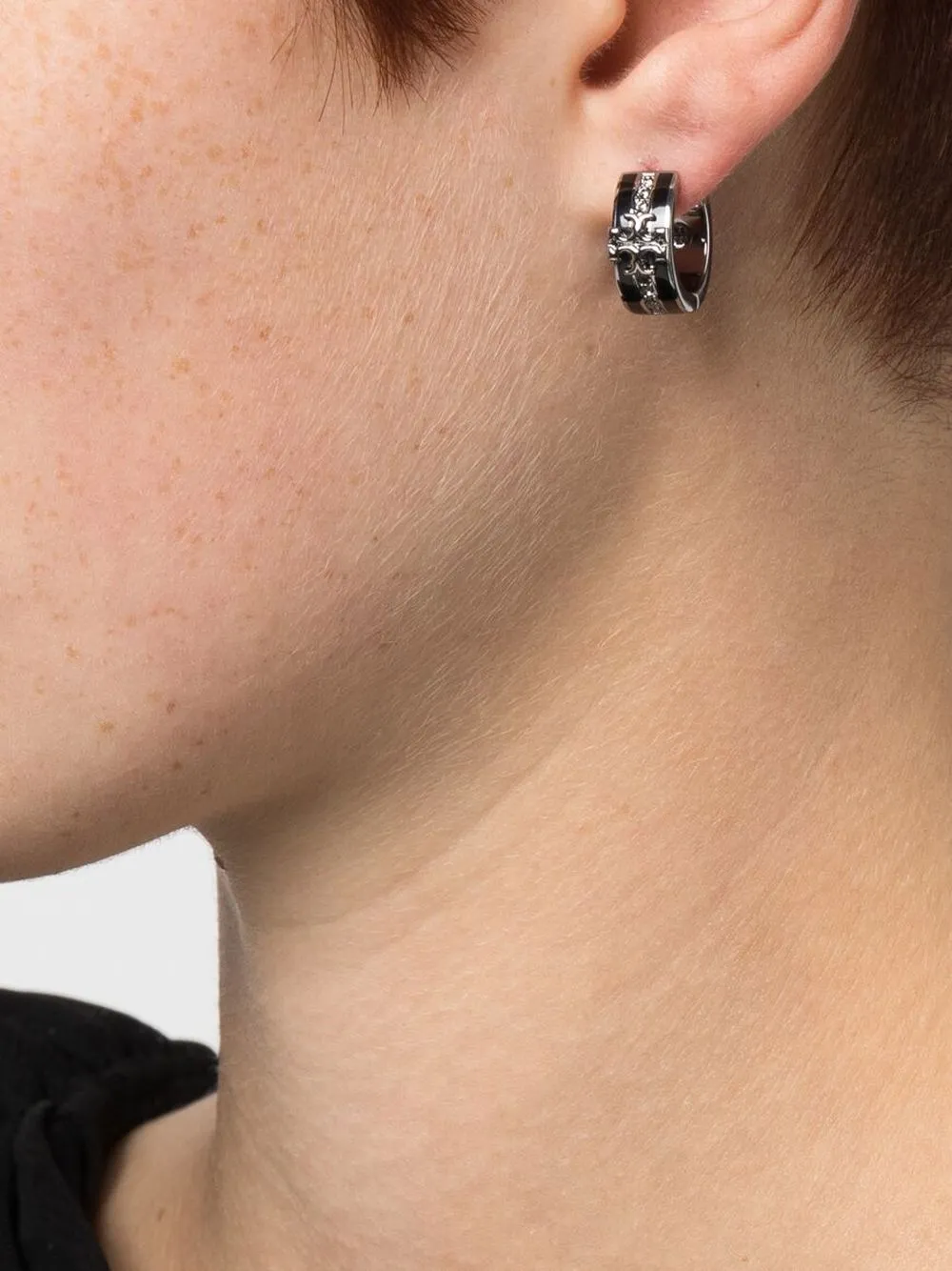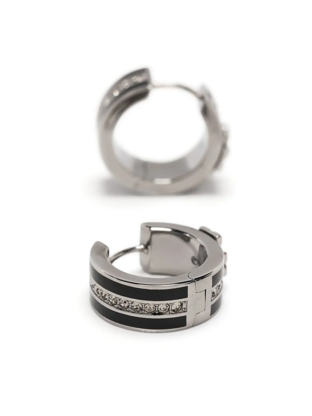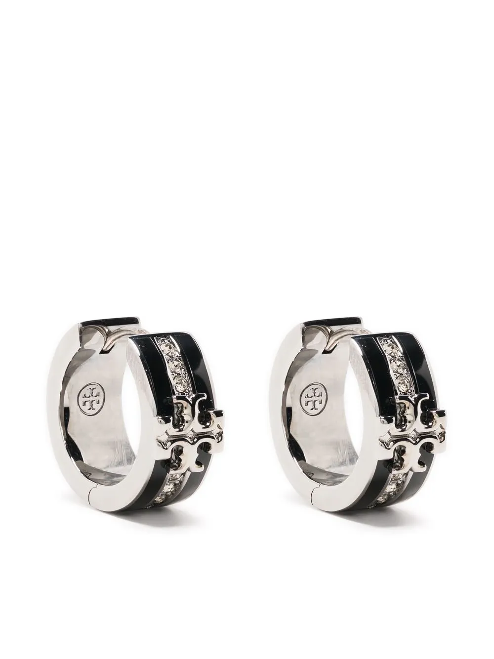 hoop-drop earrings from TORY BURCH featuring black, silver-tone, brass, crystal embellishment, medium hoop design and drop design. These earrings come as a pair..