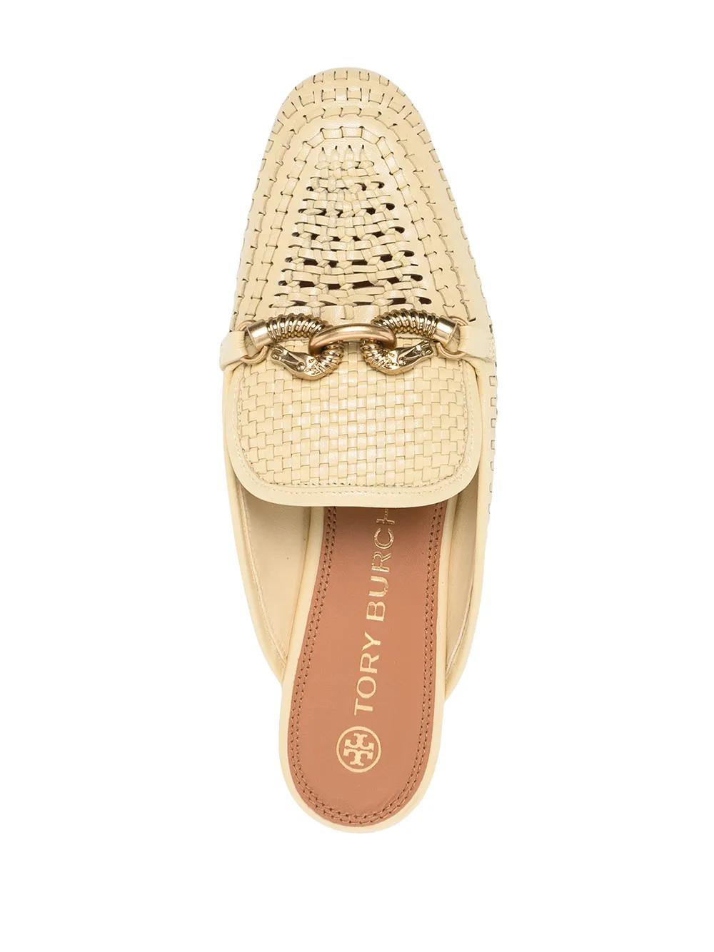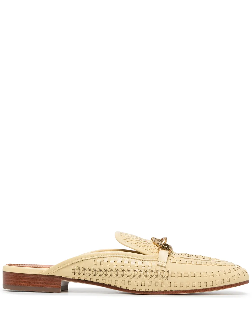 Yellow leather Jessa woven backless loafers from TORY BURCH featuring interwoven design, horse-head motif, gold-tone hardware, open back, almond toe, slip-on style, branded leather insole and low block heel.