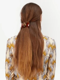 Kira barrette hairclip from TORY BURCH featuring 18kt gold plated, tortoiseshell effect, gold-tone logo plaque, French barrette fastening and brown/gold-tone.