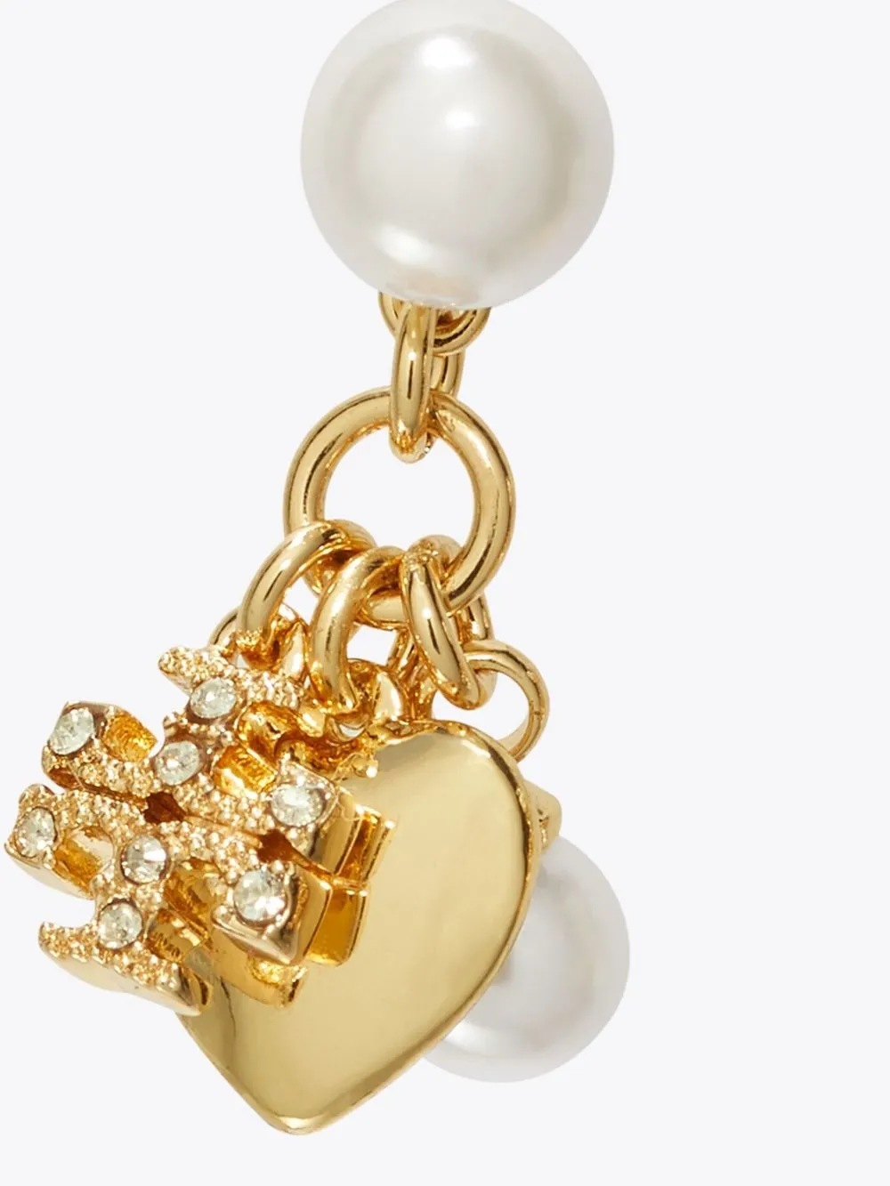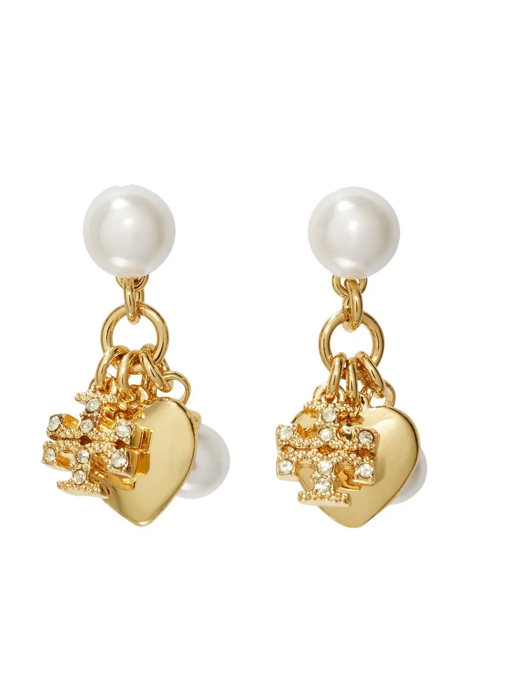 Kira charm earrings from TORY BURCH featuring 18kt gold plated, faux-pearl detailing, charm detail, drop design, gold-tone and glass. Sold in pairs..